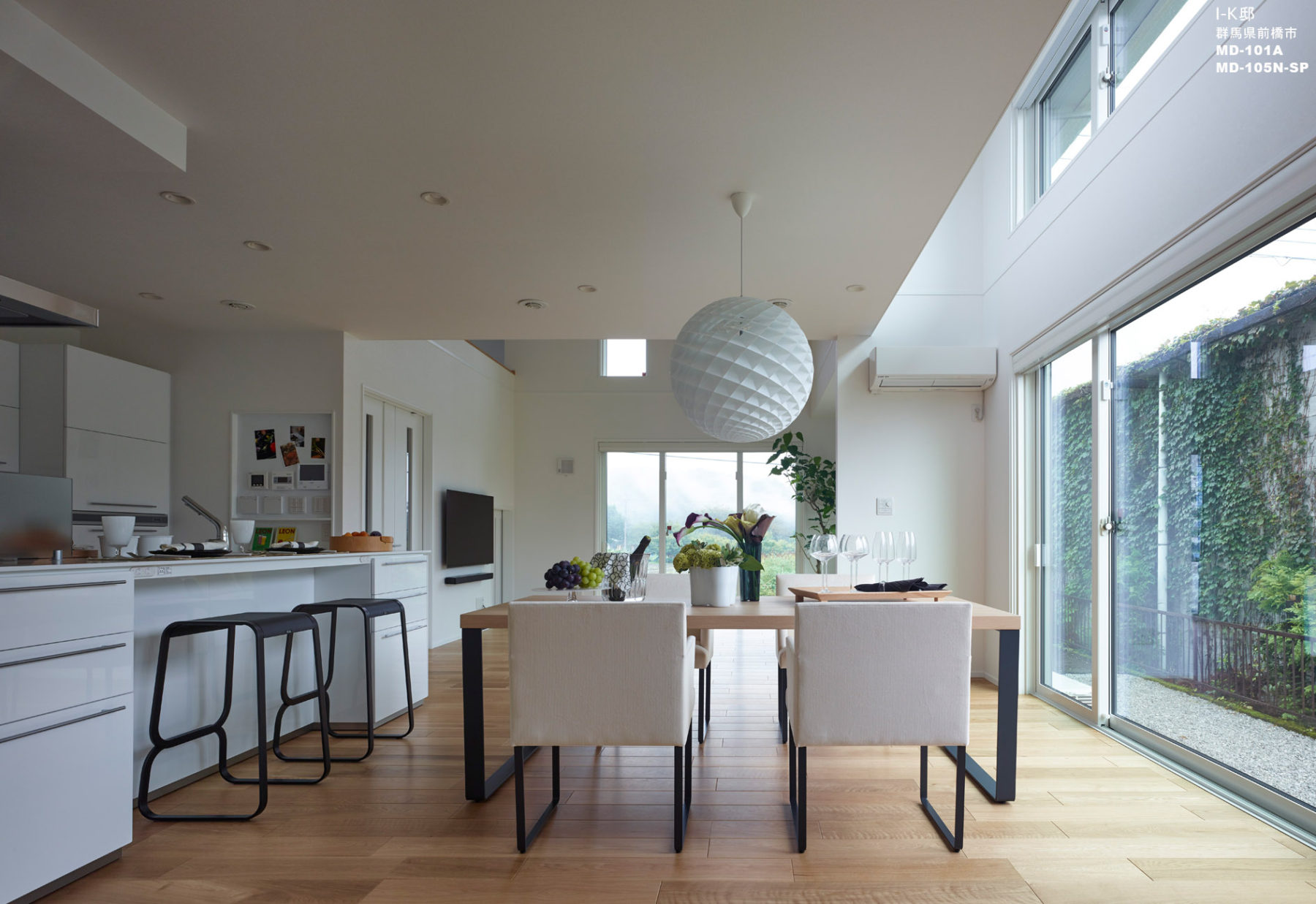 キッチンに合わせ、白を基調にコーディネート。オーク材の床を生かすために、木目が美しいテーブルをセレクト。テーブルの脚とチェアの脚をブラックのスチールで統一することで、モダンな空間に仕上げました。