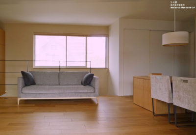 当社製品の採用理由:家族の団欒や日中お仕事される奥様の椅子として、布くるみで座り心地のよいMD-101の椅子とMD-201のソファをご提案しました。造作テーブルや収納に囲まれた中ファブリックのベージュが優しさと柔らかさを醸し出しています。キッチン作業しながらでも使いやすいように背中にハンドルもおつけしました。