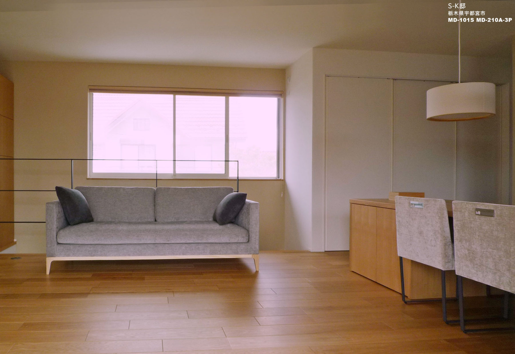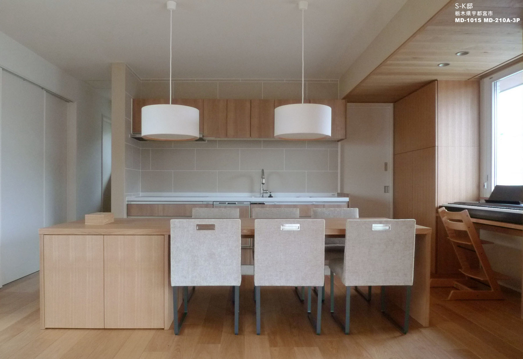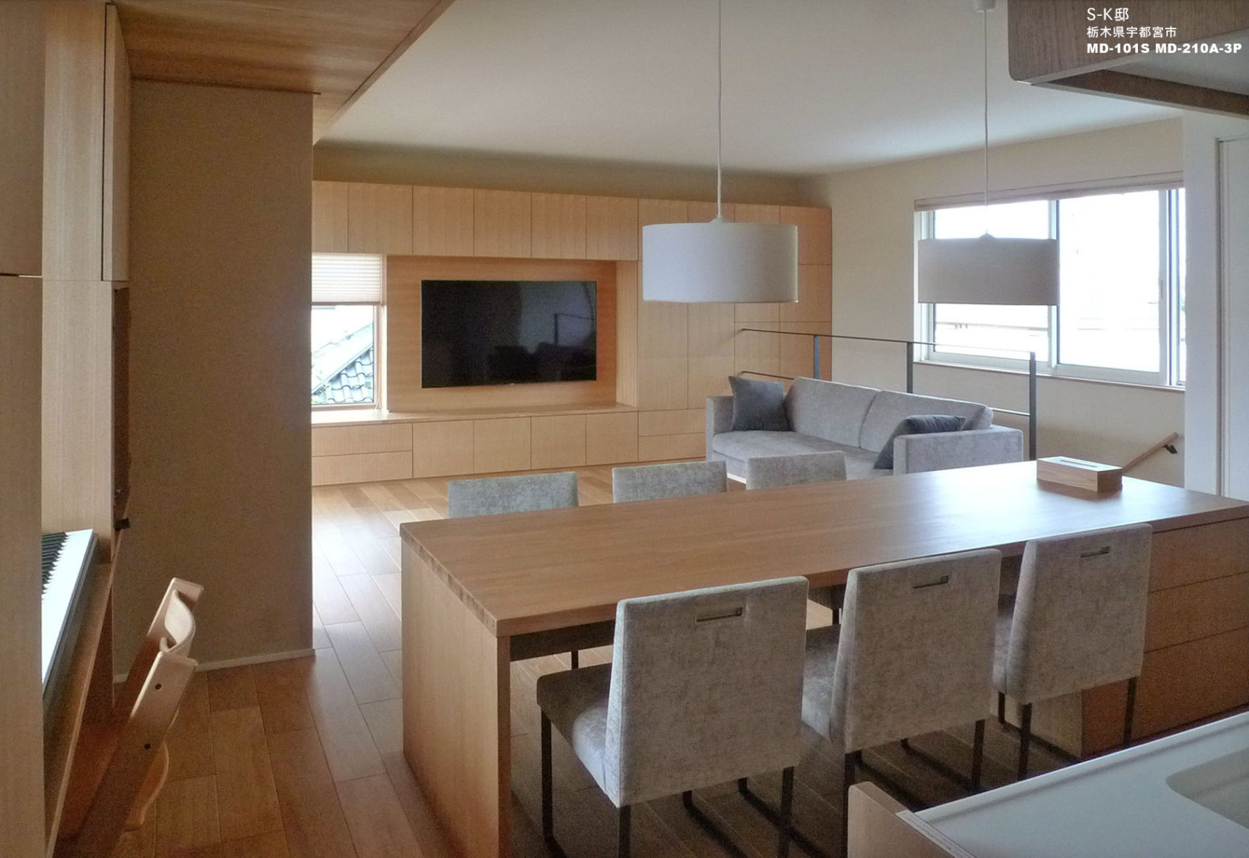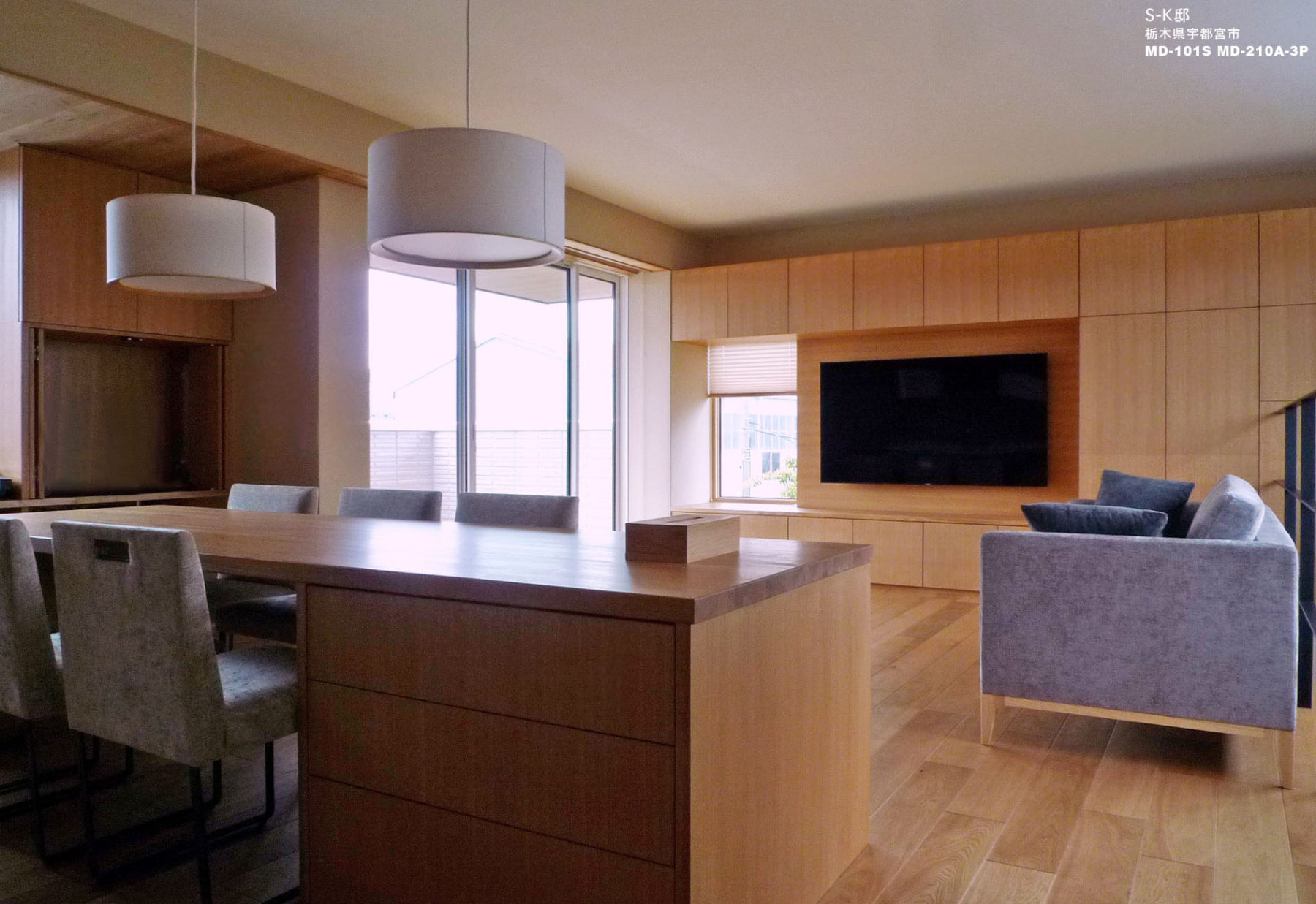 当社製品の採用理由:家族の団欒や日中お仕事される奥様の椅子として、布くるみで座り心地のよいMD-101の椅子とMD-201のソファをご提案しました。造作テーブルや収納に囲まれた中ファブリックのベージュが優しさと柔らかさを醸し出しています。キッチン作業しながらでも使いやすいように背中にハンドルもおつけしました。