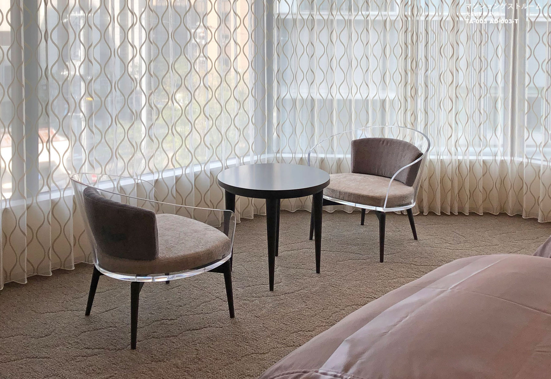 納入後の感想:ゲストルームの全体イメージは、エレガントさと柔らかさが感じられるようコーディネートし、ラウンジチェアの透明感が明るい印象の空間となりました。