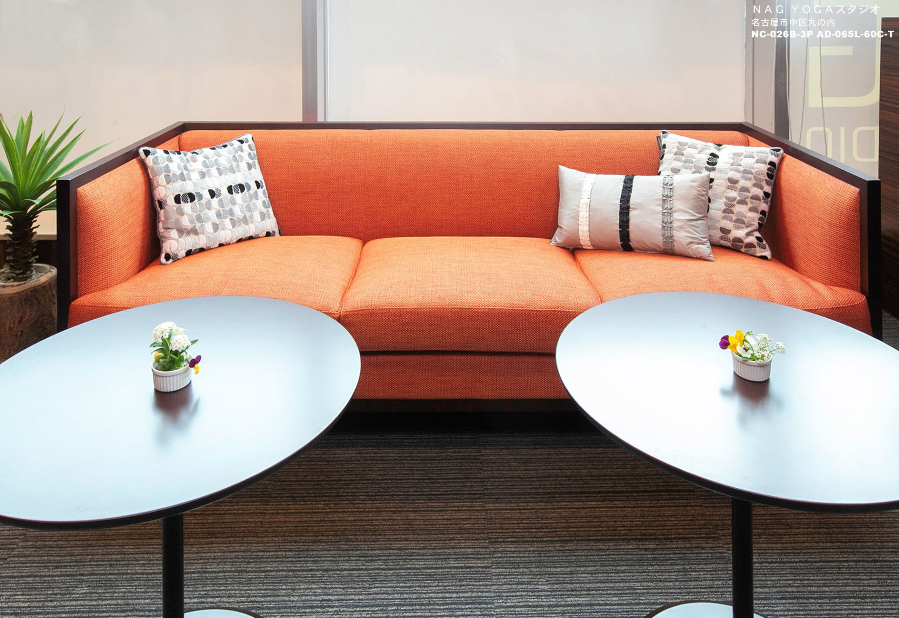 当社製品の採用理由:026ソファは輪郭となる木部がソファの形の美しさを構成して上質感と高級感を与えてくれます。リラックス感は生地の質感と色で取り入れたいと思いテーマが自然の源である太陽でしたので、あえてざっくりとした生地でオレンジ色を選びました。カサマンスのクッションをアクセントにして円形のスツールと円形のテーブルで軽やかな動きが表現できたと思います。