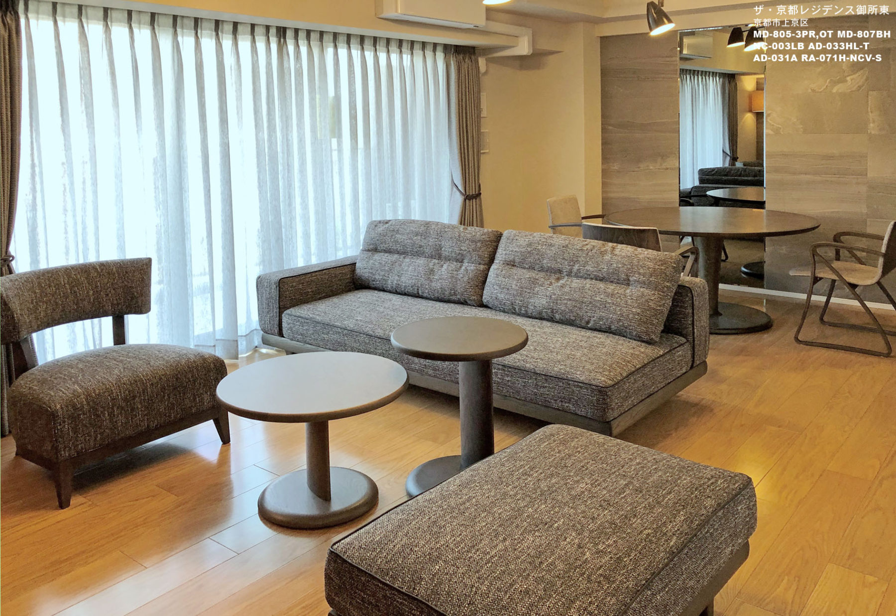 ナチュラルなベースカラースキームに、グレーから黒のモノトーンの構成でアクセントを加え、スタイリッシュでクールな空間に仕上げました。丸テーブルや曲木のカーブが、キリリとした空間にやさしく調和しバランスの取れた空間となりました。