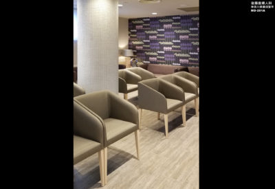 このチェアを選んだのはコンパクトなサイズでありながら座り心地が良い点とすっきりとしたデザインです。施設の性質上、張地はビニールレザーですがその端正なスタイルは損なわれることはありませんでした。