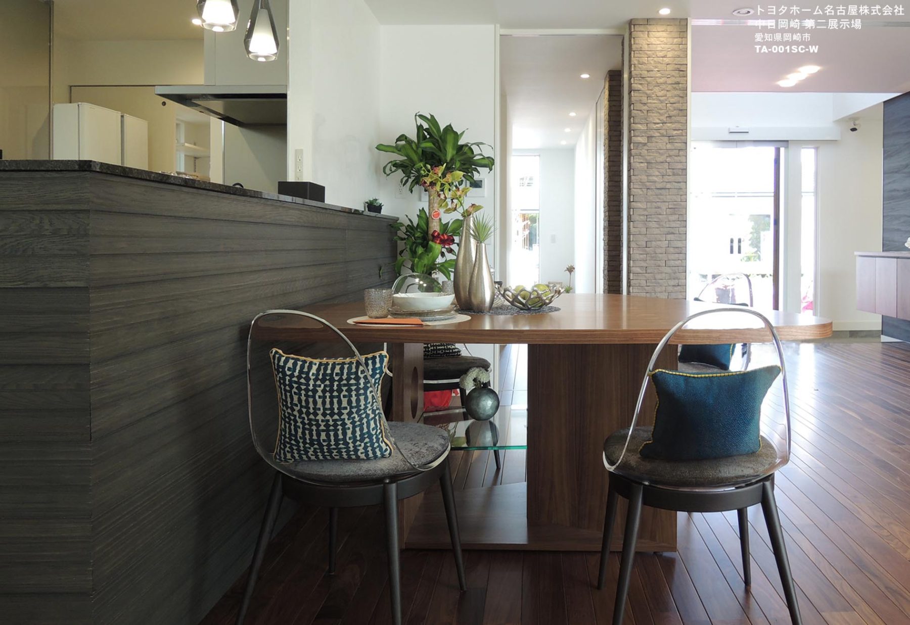 当社製品の採用理由:コンパクトさを感じさせないために透明アクリルでできた背もたれの椅子を採用しました。背面からの見た目も美しく気に入っています。小さいクッションでアクセントをつけました。