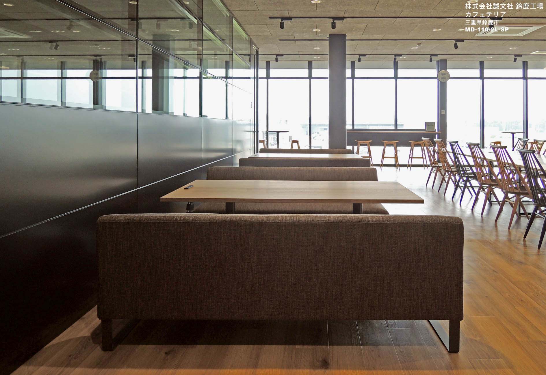 当社物流事業部の主要拠点として東名阪自動車道(鈴鹿IC)に程近い工業団地に、工場併設の社屋を新築しました。納入したソファの設置場所は、オフィス棟2Fのカフェテリアとなります。建屋三方をガラスで囲われた明るい吹抜けホールに面するカフェテリアには、高さの異なるテーブルを用意してあり、用途・気分によって使い分けができるレイアウトになっています。ソファに合わせるテーブルは、一般的な打合せテーブルより低めのH=640にしてあり、着座位置を下げることでゆっくりと過ごせる設としています。