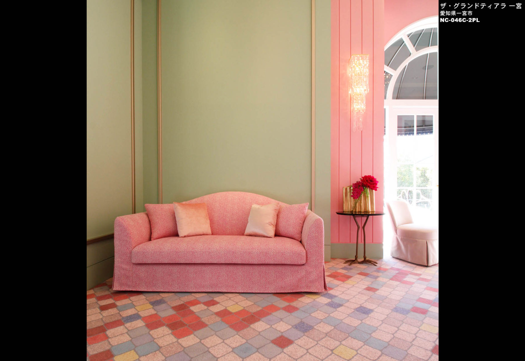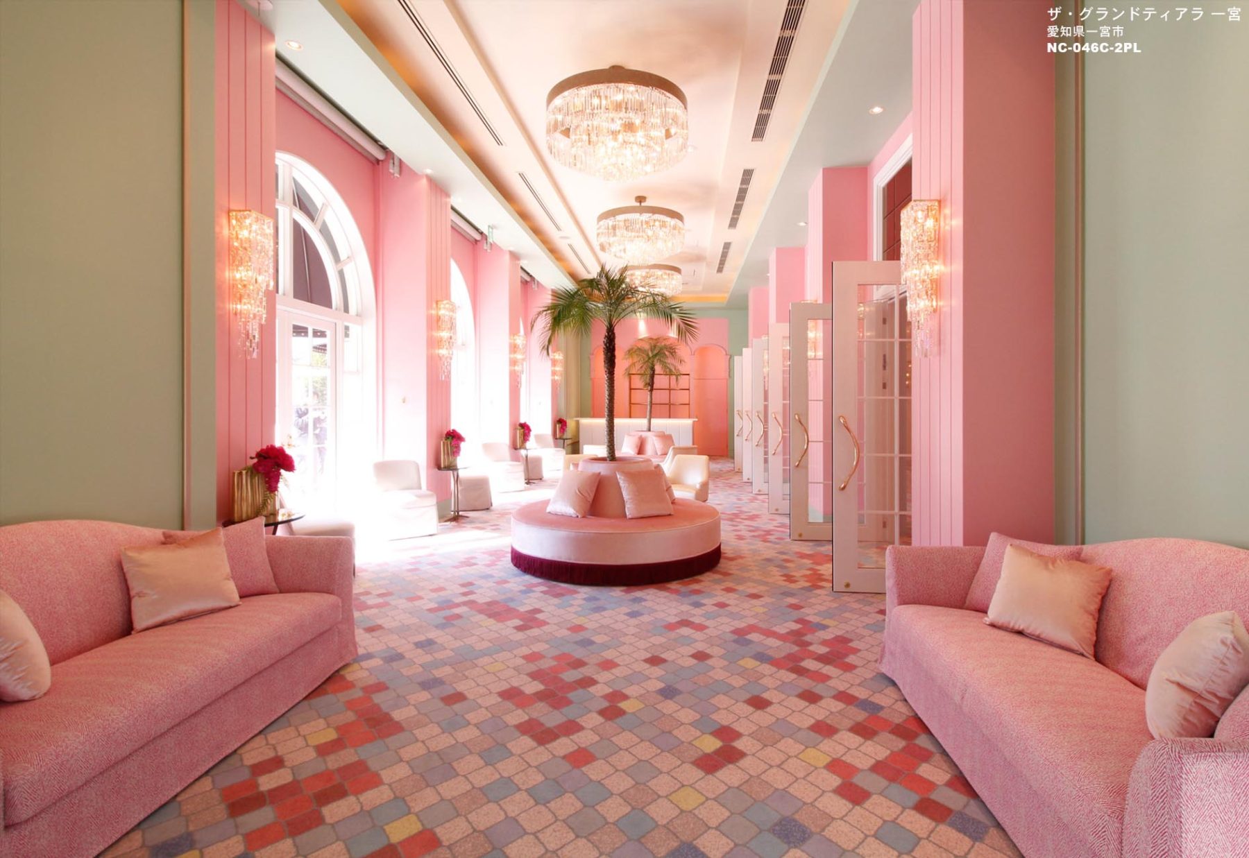 リニューアルにあたり、イメージの一新と「Sweet Dreamー夢を見ているような空間」を目指しました。「大人・可愛い」をコンセプトに幸福感を演出する「背景」となるインテリア。ピンクを基調としたパステルカラーを空間に展開。素材は、ベルベットやシルクの光沢や質感を大切にし、上質感のある演出を心掛けています。