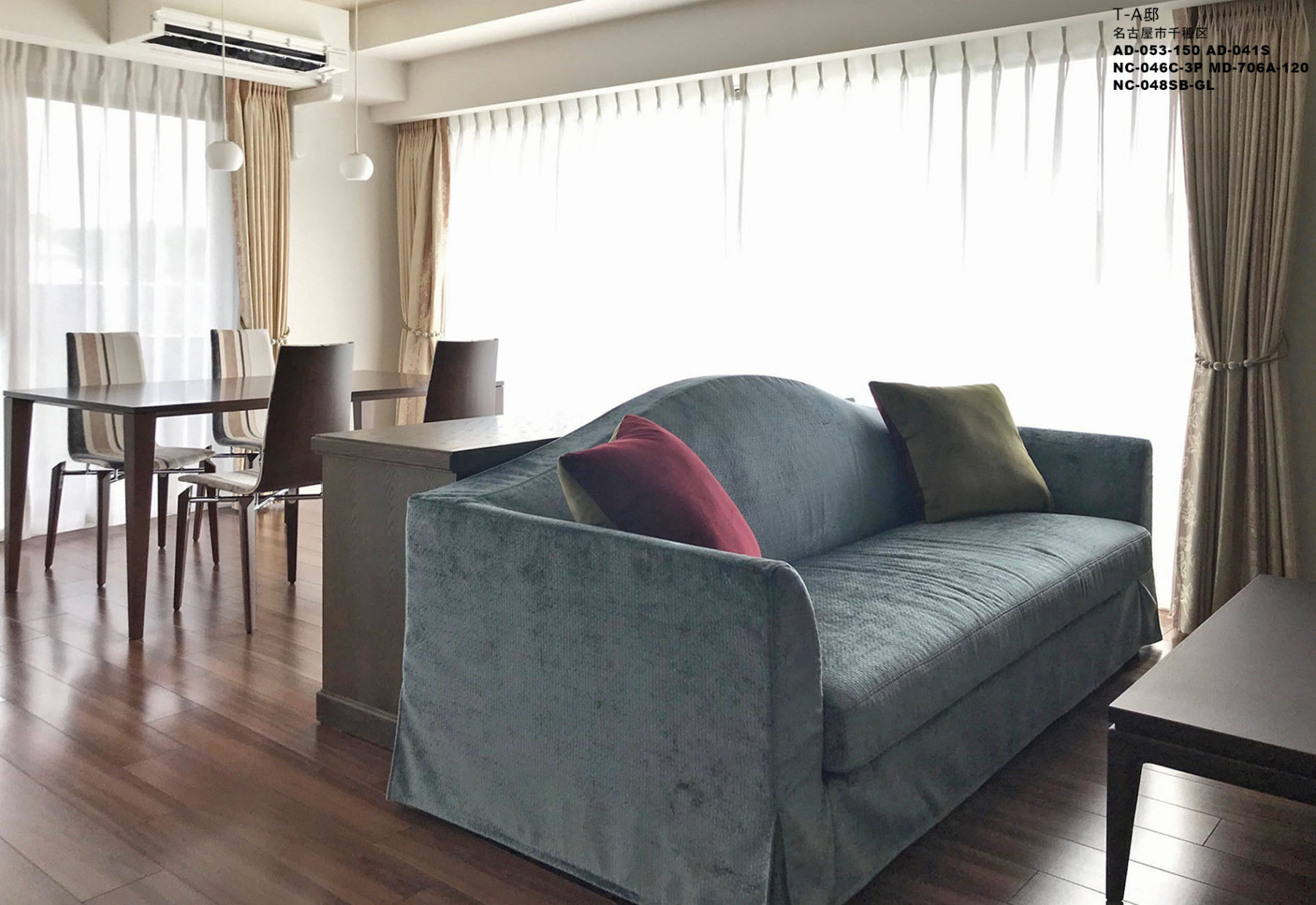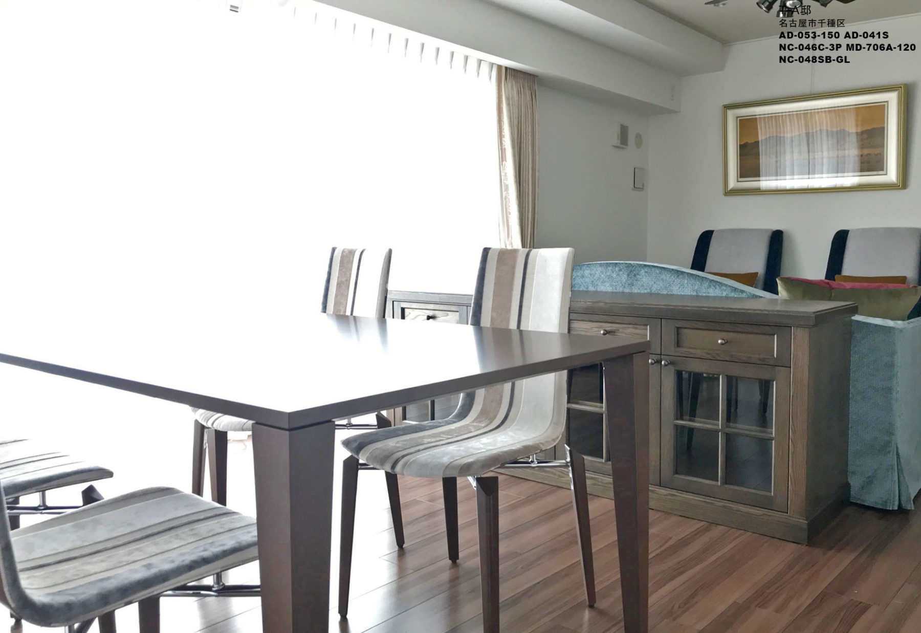 お施主様は、来客が多いためリビングには応接セットの設置をご希望、ただし会社の応接室のような重厚な家具ではなく、明るくカラフルな色使いの家具をご希望でした。そこで『NEO CLASSICO Heritage』からソファやラウンジチェアを選び、張地やクッションを2色使いとし、カラフルなインテリアコーディネートを目指しました。ダイニングは奥様が軽量のダイニングチェアをご希望だったことから、『AD CORE』の『CERVO Ⅲ』をご提案しました。リビングとダイニングの間には、緩やかに空間を仕切り、奥様が収集したコレクションを飾れるように、キャビネットを設置しています。