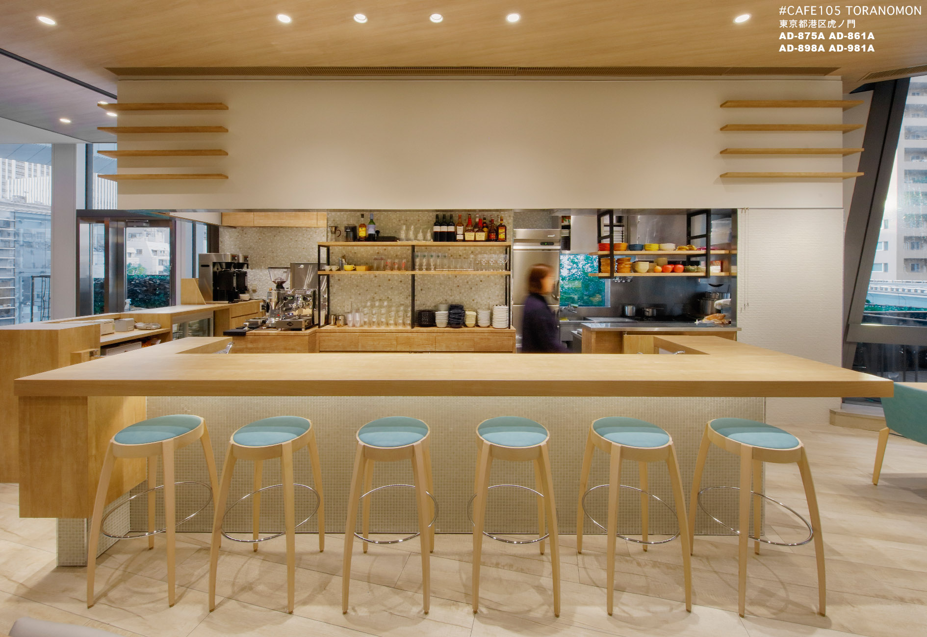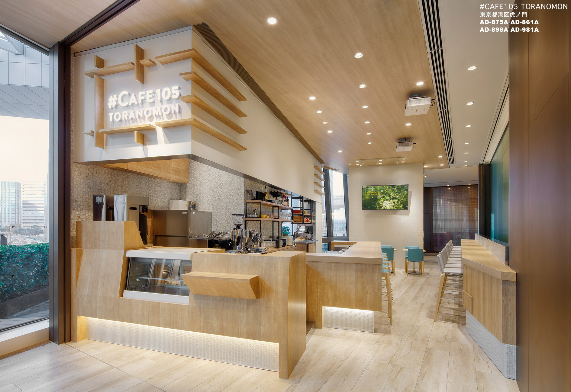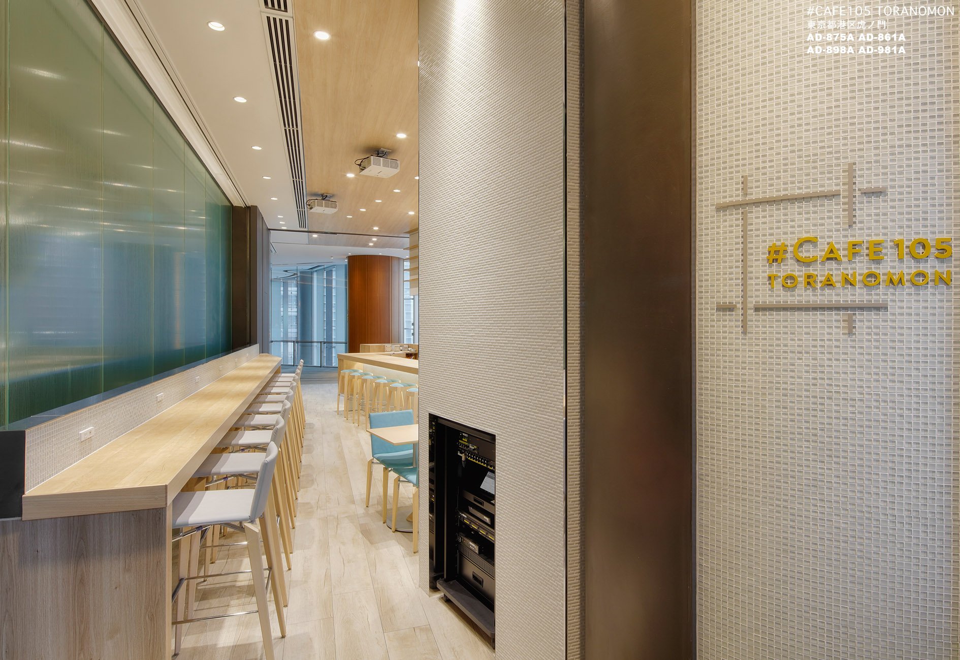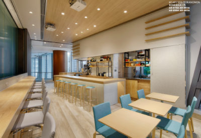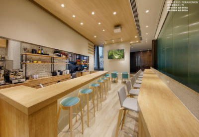 虎ノ門ヒルズのホールで開催される様々なイベントと連動することを目的としたカフェとなります。通常は一般的なカフェ営業。イベント連動時は大きな垂れ壁に会場の様子を投影するサテライト的なカフェという2つの顔を持っています。女性客の取り込みと親しみやすさを意識して、ナチュラルで明るいデザインを展開しました。木調を基本としながらも、数種類のガラスタイルを散りばめる事で清潔感を高めています。