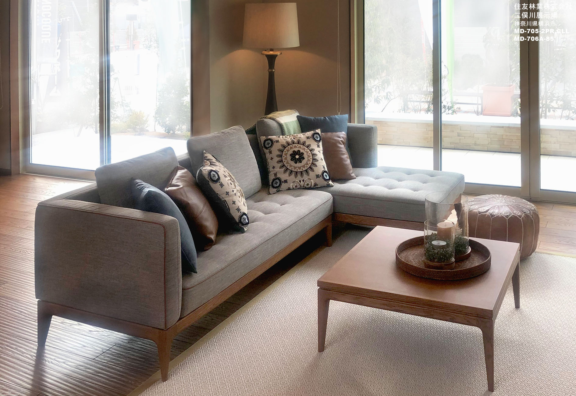 当社製品の採用理由:くるみボタンやパイピング、ルーバー扉などがレトロな雰囲気の造りにぴったりだったので採用しました。また、展示場のソファはお客様に座っていただいて記名やお茶を飲んでいただく為、沈み込みが少なく型のしっかりしたソファである事も条件の一つでした。