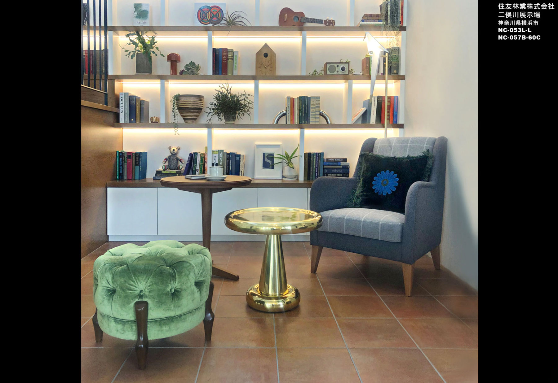 当社製品の採用理由:くるみボタンやパイピング、ルーバー扉などがレトロな雰囲気の造りにぴったりだったので採用しました。また、展示場のソファはお客様に座っていただいて記名やお茶を飲んでいただく為、沈み込みが少なく型のしっかりしたソファである事も条件の一つでした。