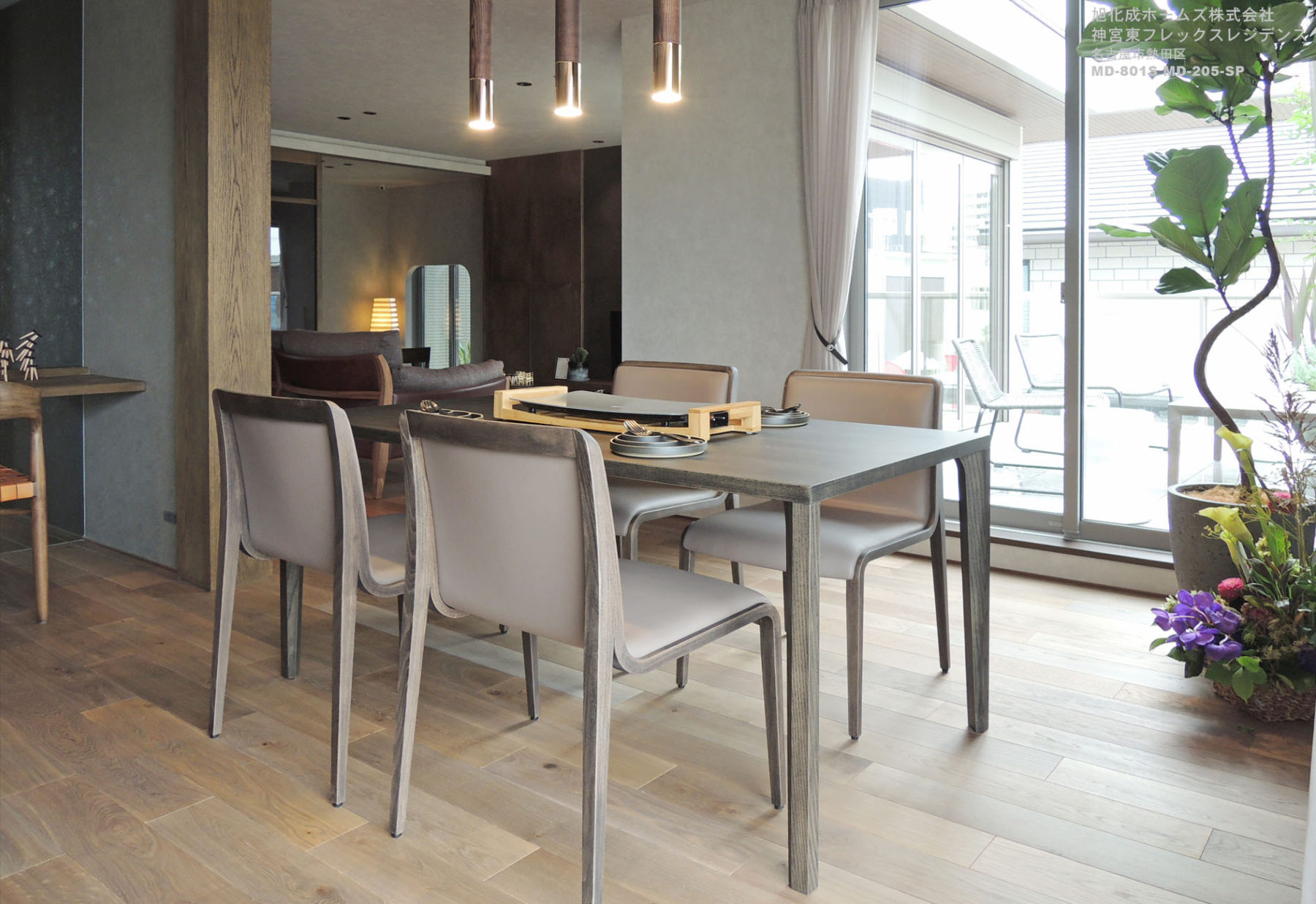 2.7mのダイナミックな空間に大判タイルや石を使用し、ハイスタイルに仕上げた1Fに対して、草木染の無垢床やグレイッシュな素材を使い、クラシカルでありながらモダンに、ラグジュアリーでありながらすっきりと仕上げた2FLDK+和室のインテリアです。