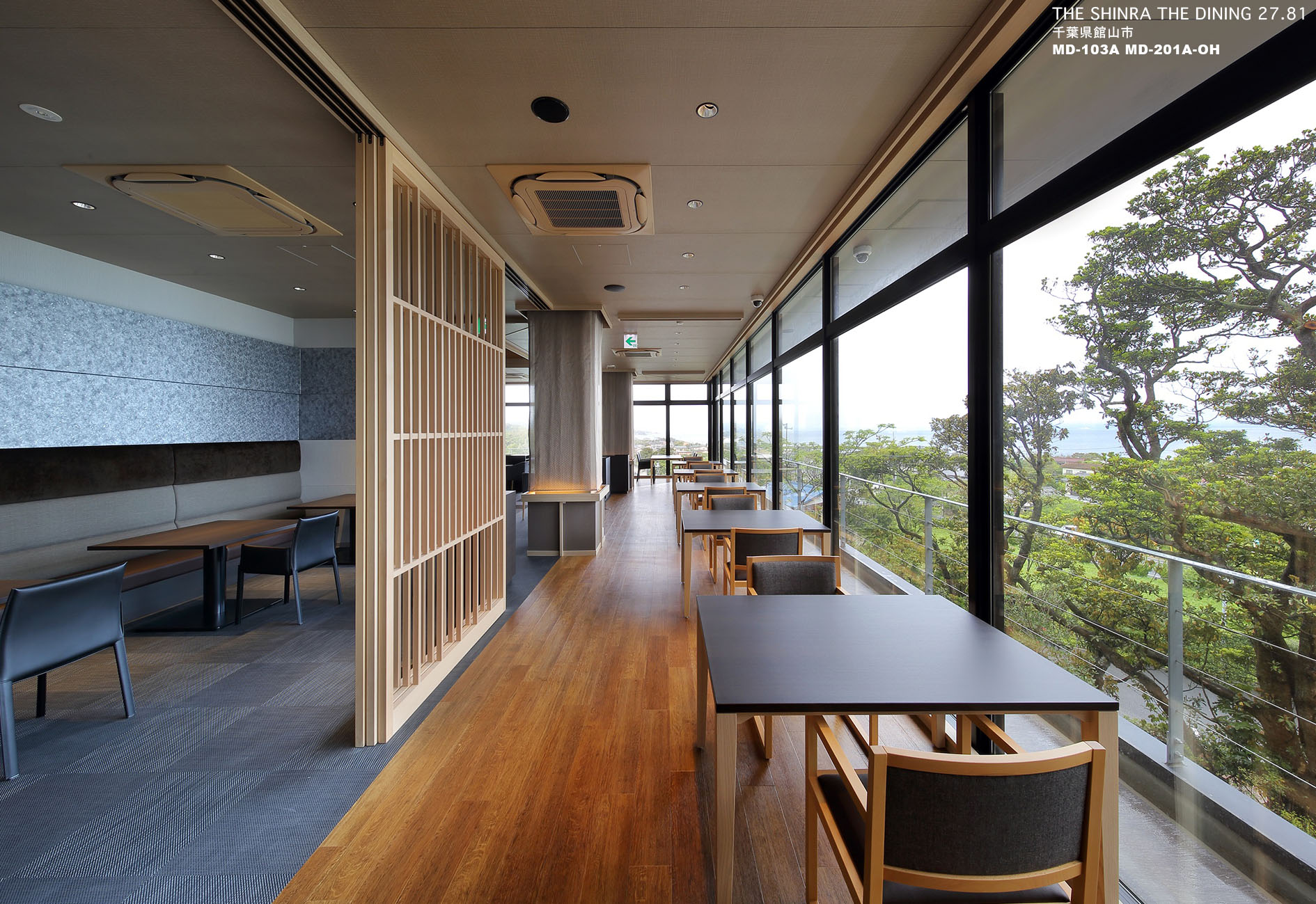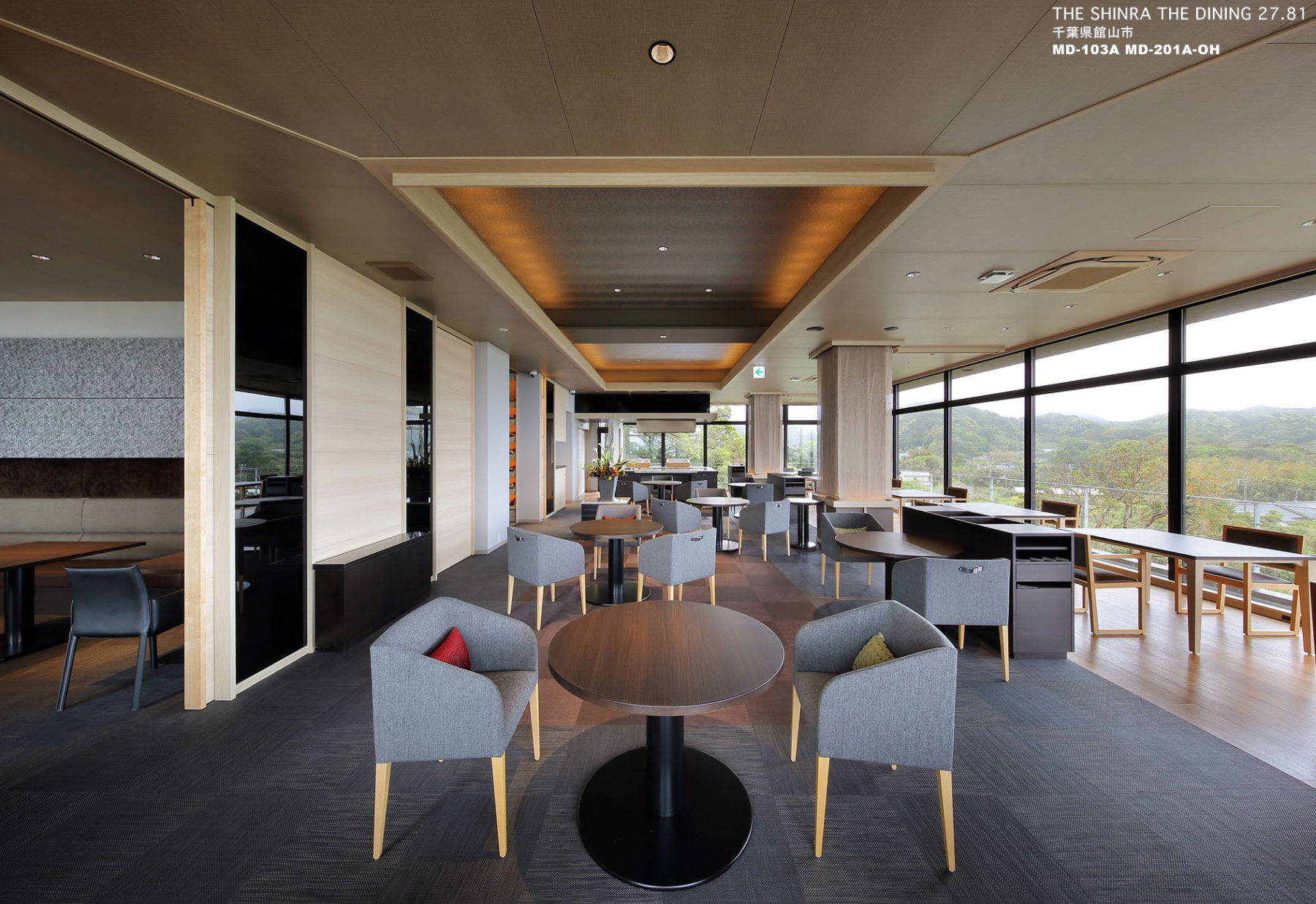施設の北側には穏やかな館山湾の景色と里海の風景があり、南側には暖帯林の茂る丘陵地帯の景色と里山の風景があります。この豊かな景色と風景を楽しめる施設を目指しました。施設内部は、洋の佇まいの中に和の寛げる雰囲気を作り出すことを目指しました。