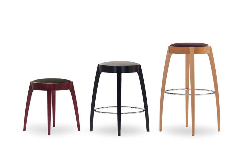 当社製品の採用理由:売場手前側のテスターカウンターでは、イメージカラーがアイキャッチになるよう背面の張地面積が大きく、脚高さをジャストサイズに調整できるLUSSOのカウンターチェアを採用しました。売場奥側のミラー前には、ラグジュアリーラインの商品イメージに合わせて、ゆったりくつろげるNC-061Aと荷物置き用にも使えるMEDUSAのスツールを配置しました。