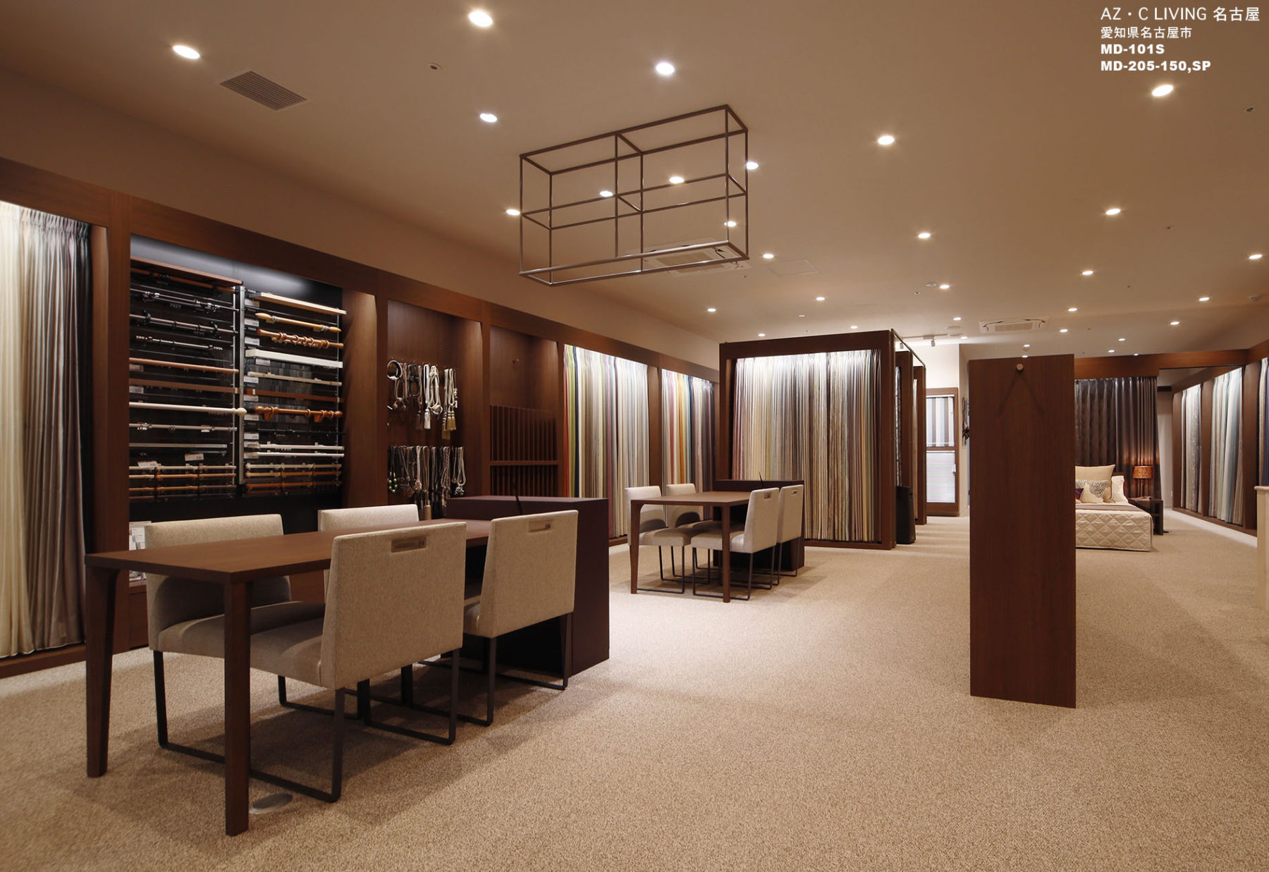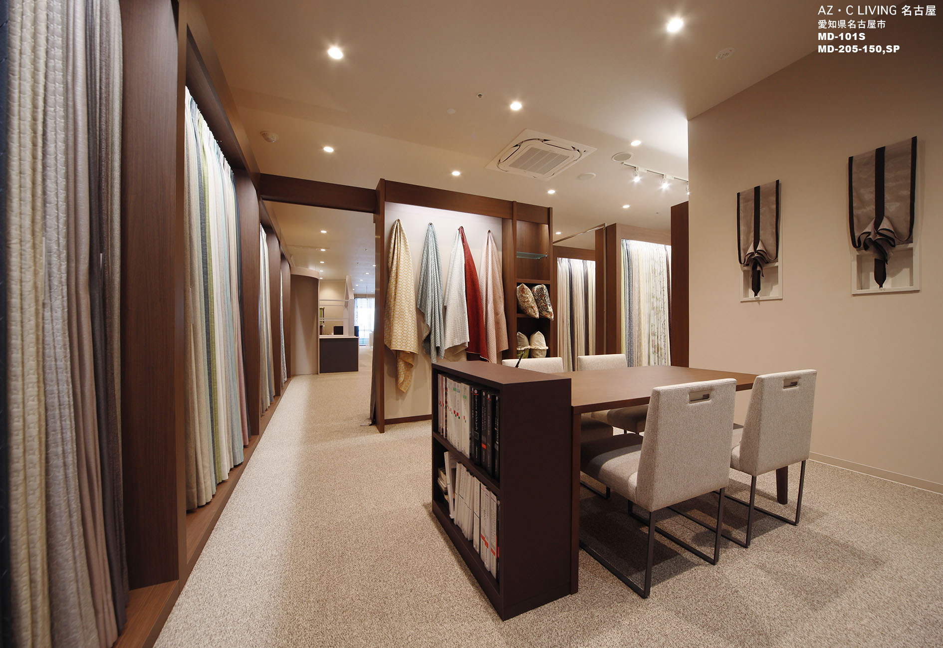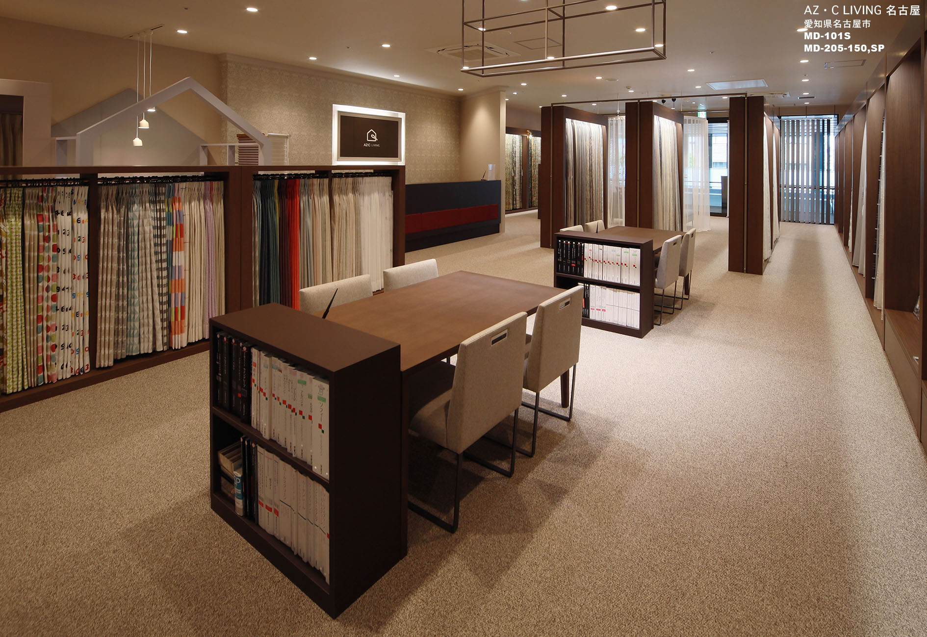 AZ. C LlVING はカーテンの専門店として、デザイン、カラー、素材、スタイル等多彩なアイテムを使ってお客様の暮らしに寄り添い日々のライフスタイルを素敵にする提案をしています。約1000本と豊富なファプリックサンプルと、店舗入り口からリビングルーム・キッズルーム・ベッドルームと住空間が連想できるディスプレーでお客様のインスピレーションを高めています。