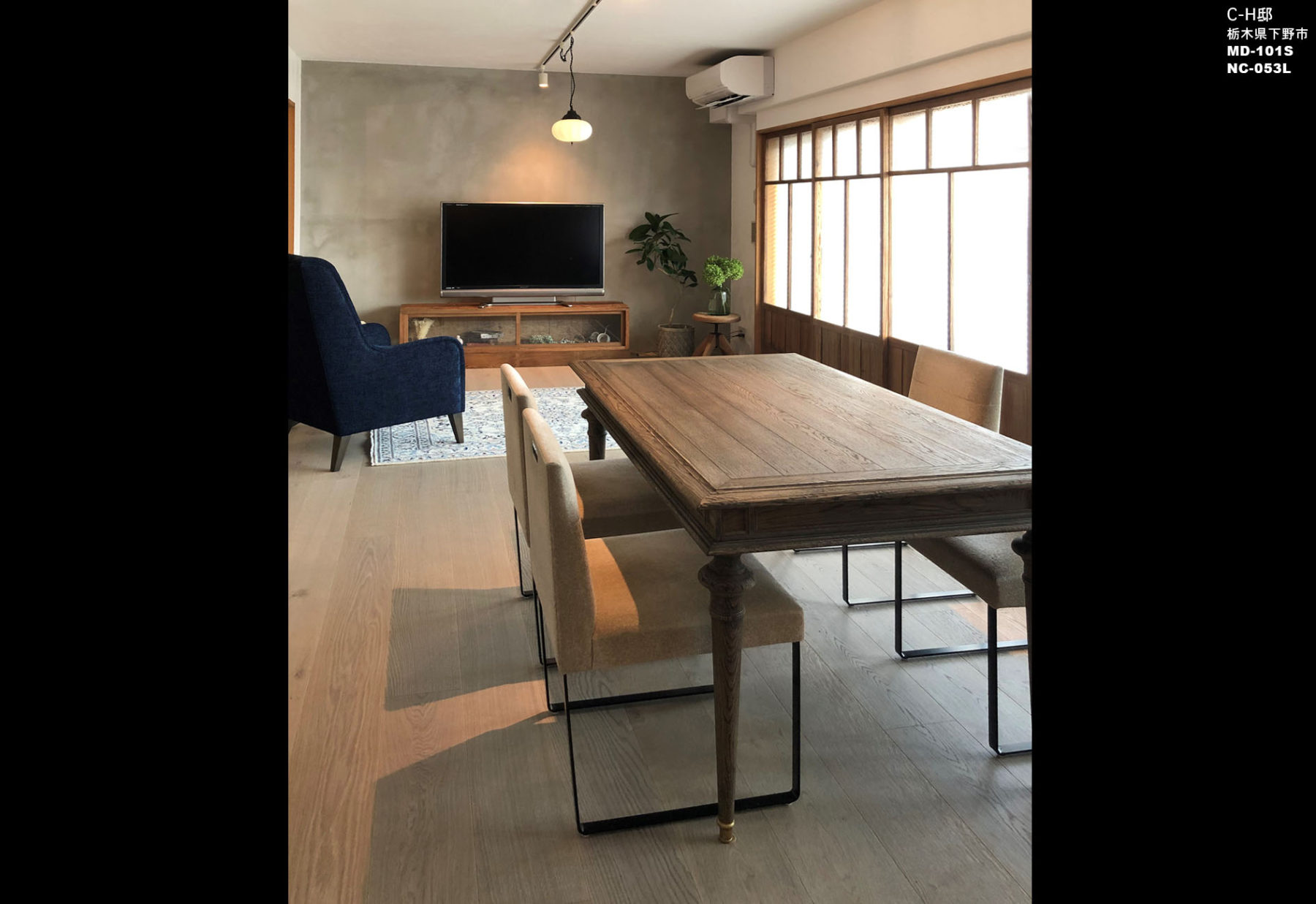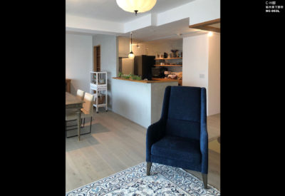 当社製品の採用理由:既にお持ちだったお気に入りのダイニング椅子MD-101の優しいベージュの張地がインテリアにしっくりと馴染み、更に追加でNC-053-Lをパーソナルチェアーとしてご提案しました。施主にとってソファーではなく、パーソナルな時間にふさわしい座り心地のよい椅子が必要と感じました。