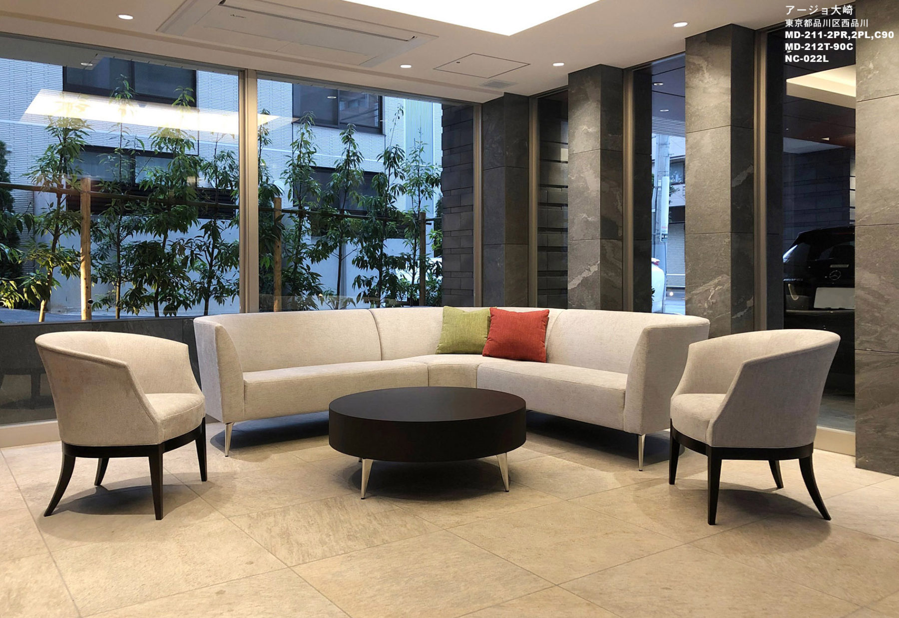 再開発で脚光を浴びる品川エリアのJR山手線大崎駅徒歩6分の立地にあるプレミアムなコンパクトマンション。家具は柔らかなカーブを描く優しいイメージ。全体的に丸みを帯びたデザインと共用部に馴染んだグレー系の張地とアクセントに差し色を入れたコーディネートです。