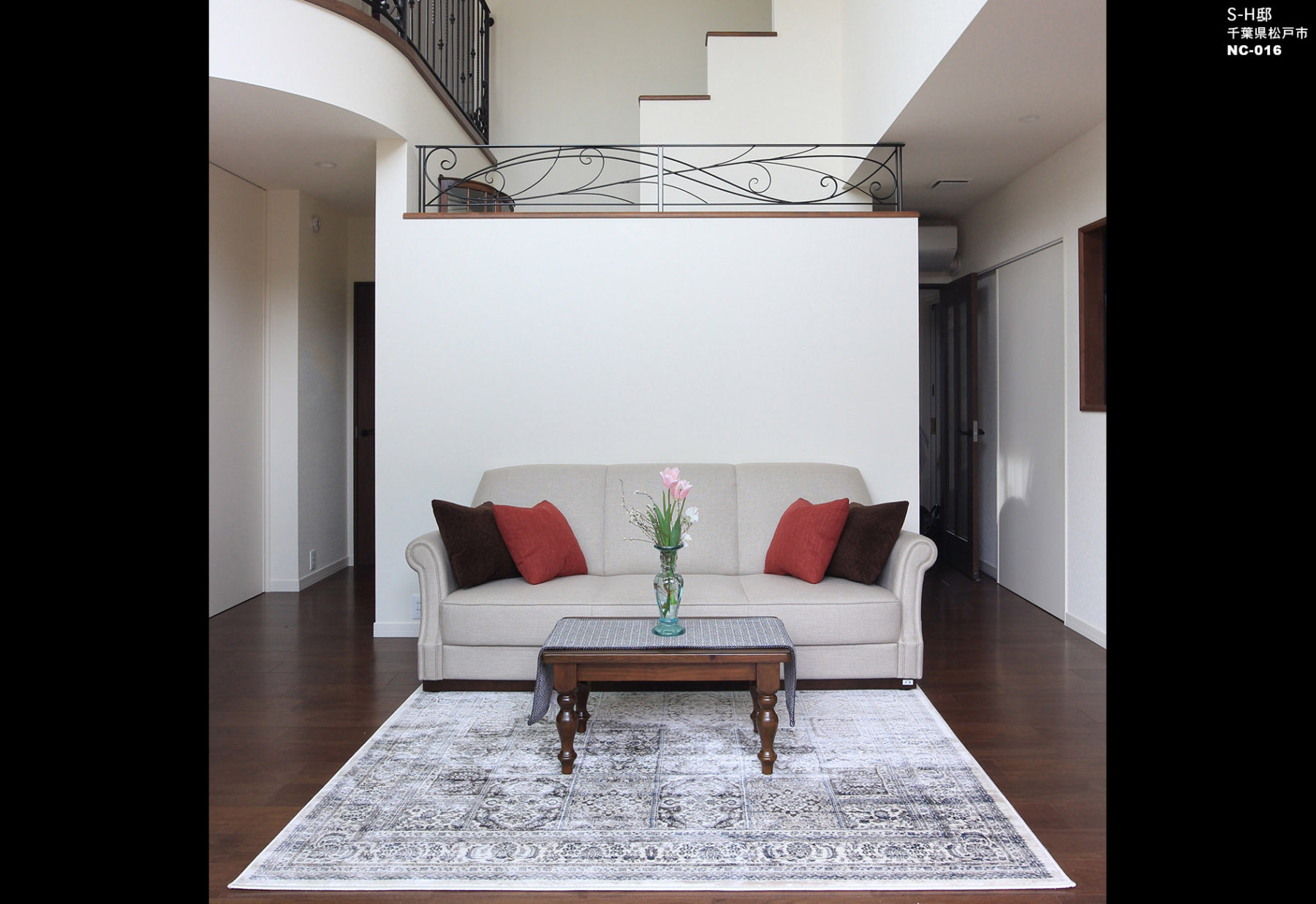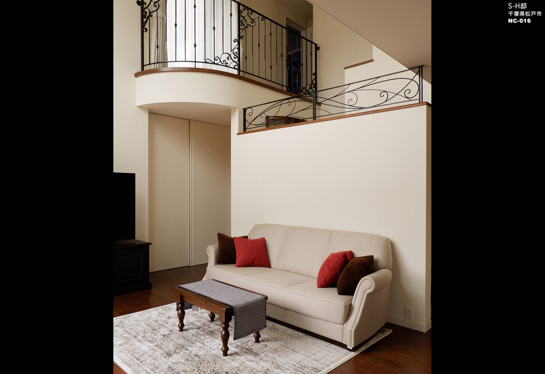 吹抜けや大開口の窓がある開放感あふれるリビング 。アイアンや曲線を取り入れた優美なデザインの邸宅です。