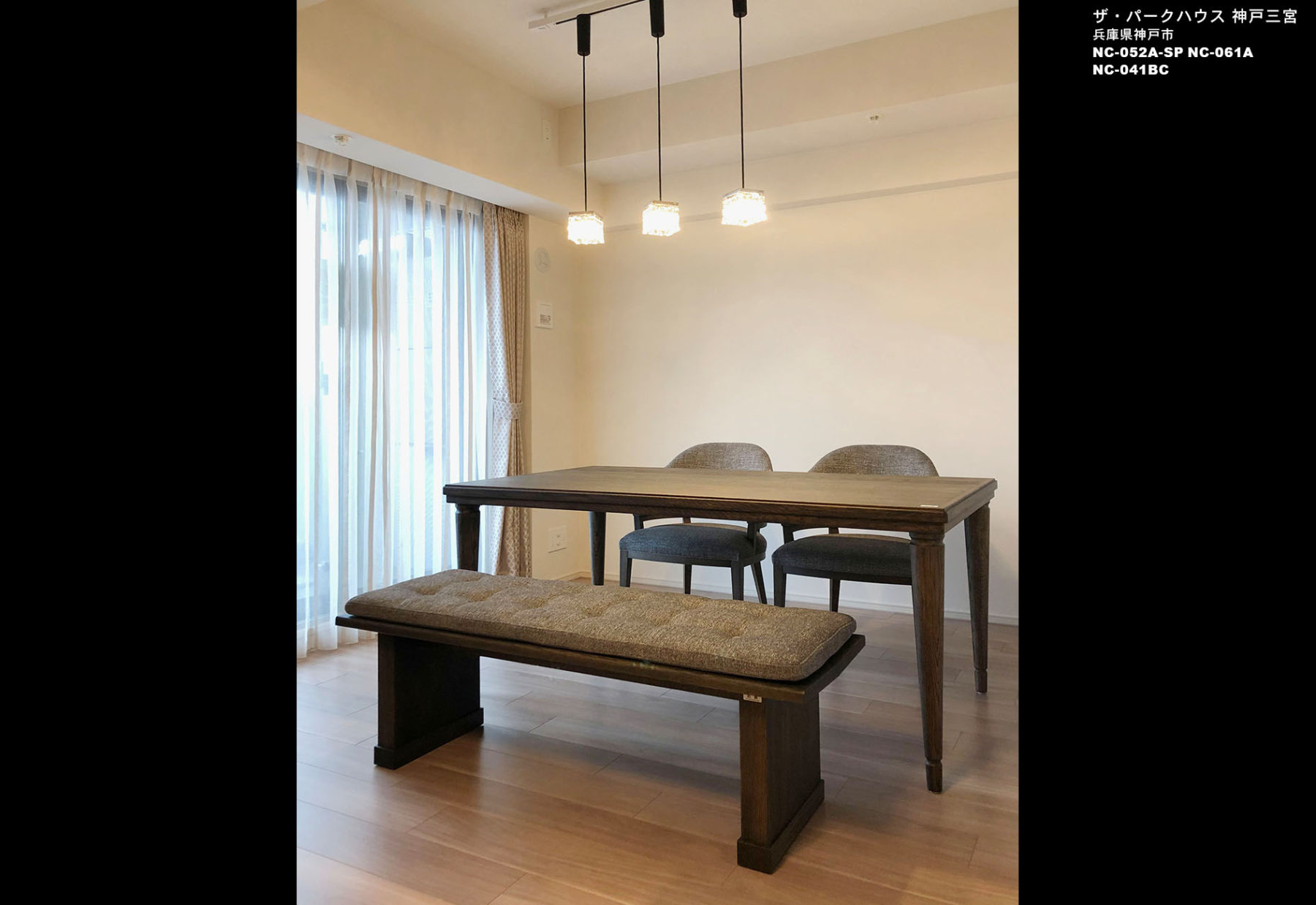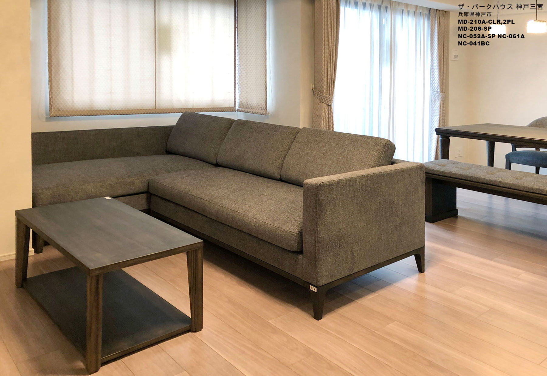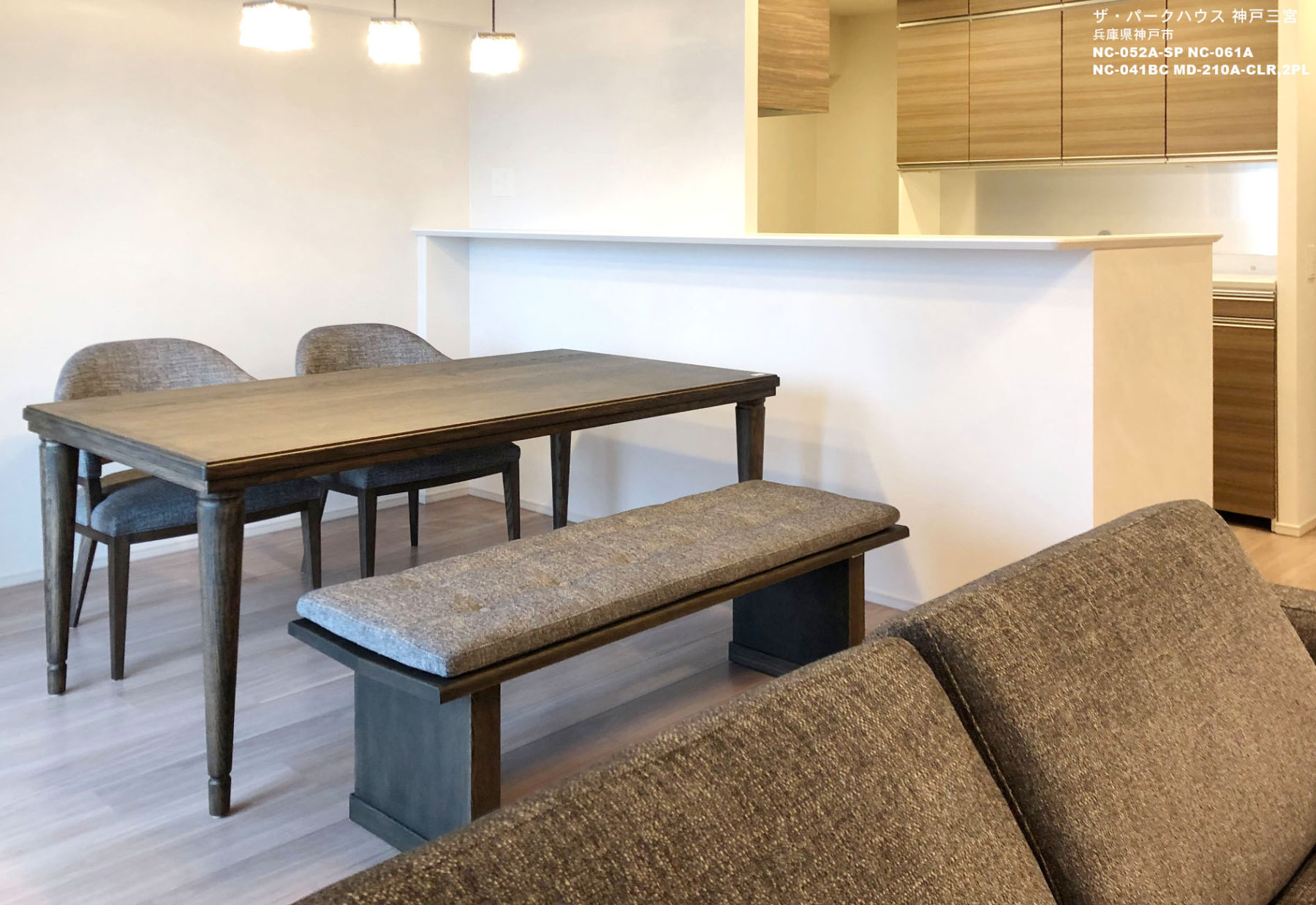 明るめのグレイッシュなフローリングをいかし、ダイニングセット、ソファセットとも木目カラーと座面の張り地をお客様のお好みのグレー系でまとめました。家具はグレー系でシックなイメージですが、照明やカーテンを女性らしい華やかでエレガントなタイプをセレクトし、モダンなイメージとエレガントなイメージをバランスよくコーディネートしました。