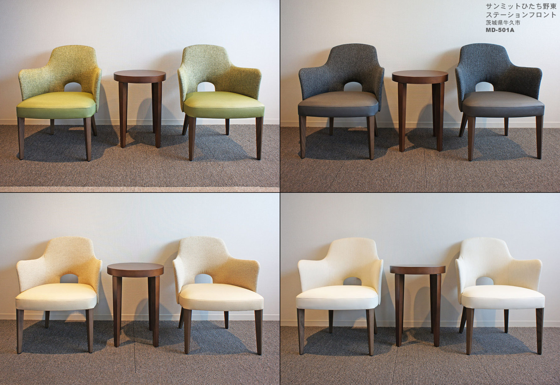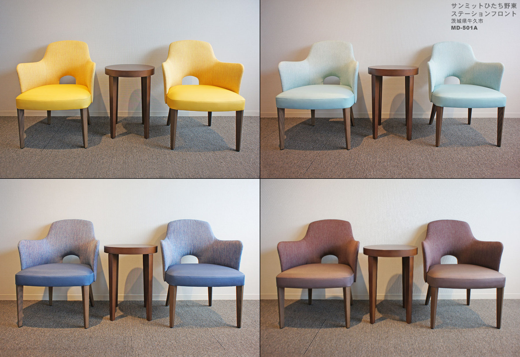 EVホールのチェアについて、売主の「シニアが各階を認識しやすく、かつ日々を楽しく過ごして頂けるよう、各階の特色を出したい」という意向を元に、各階ごとに色が違い、また角の無い丸みのある優しいデザインのチェアが選ばれました。
