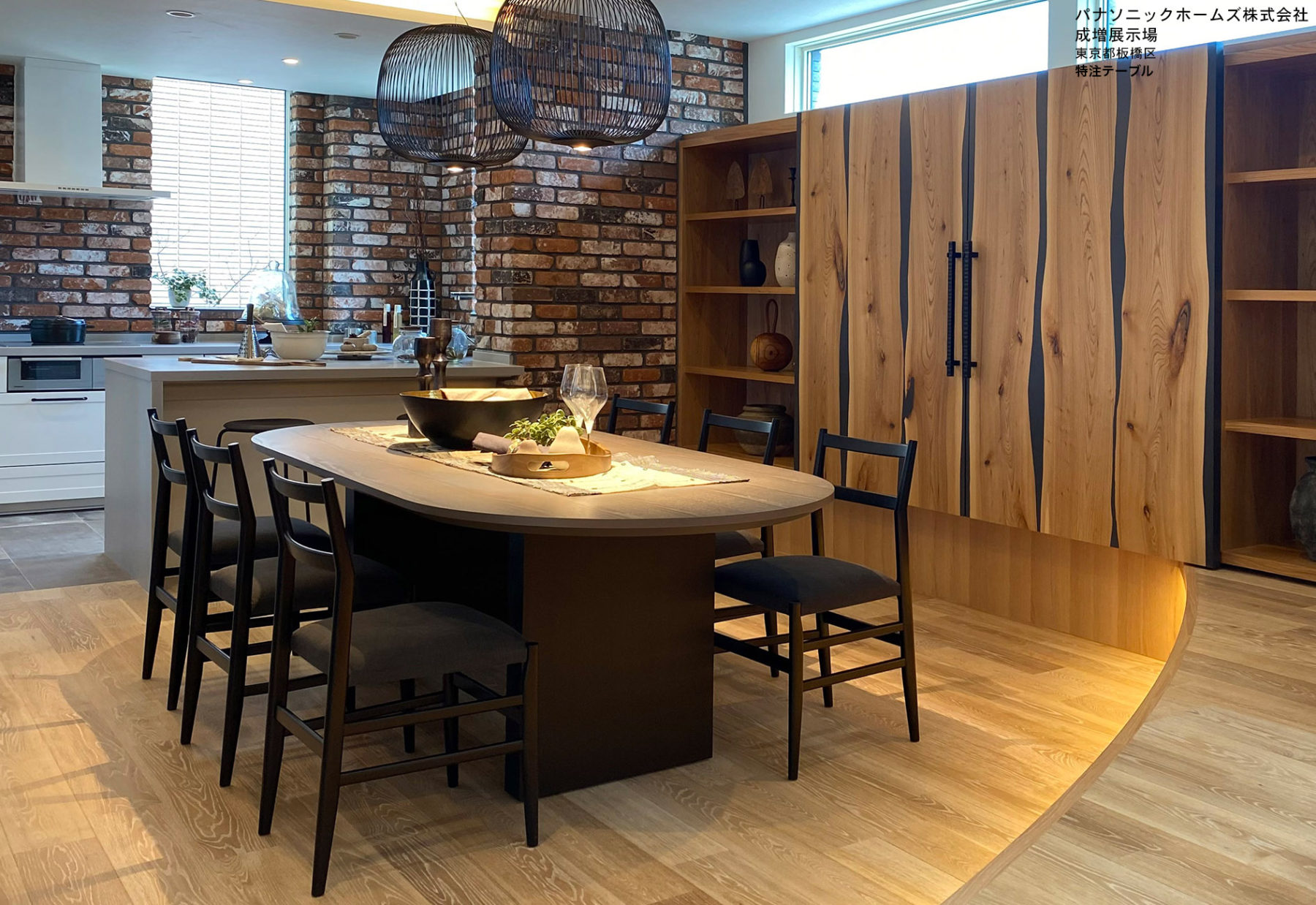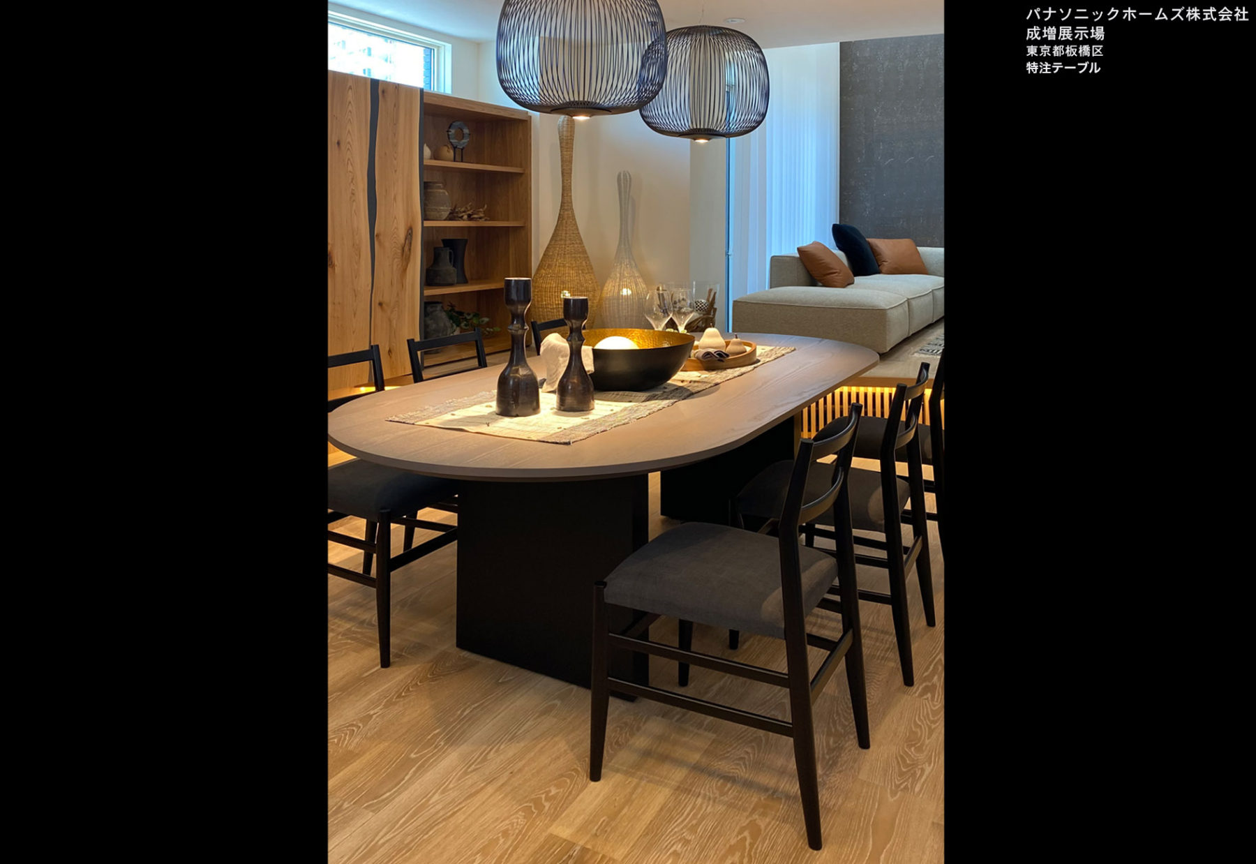 当社製品の採用理由:LDKの空間のメインの家具となるダイニングテーブルの色とフォルムにこだわりたかったため、それらのオーダーに柔軟に対応して下さるAD COREさんに依頼しました。