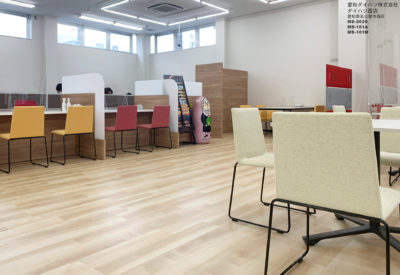 愛知ダイハツ様のコーポレートカラーである、レッドに、「Light you up」のカラー4色とポイントカラーにアイボリーを加え、広く開放的な空間に様々な世代のお客様が安心して立ち寄っていただけるようデザインしました。