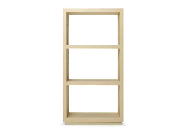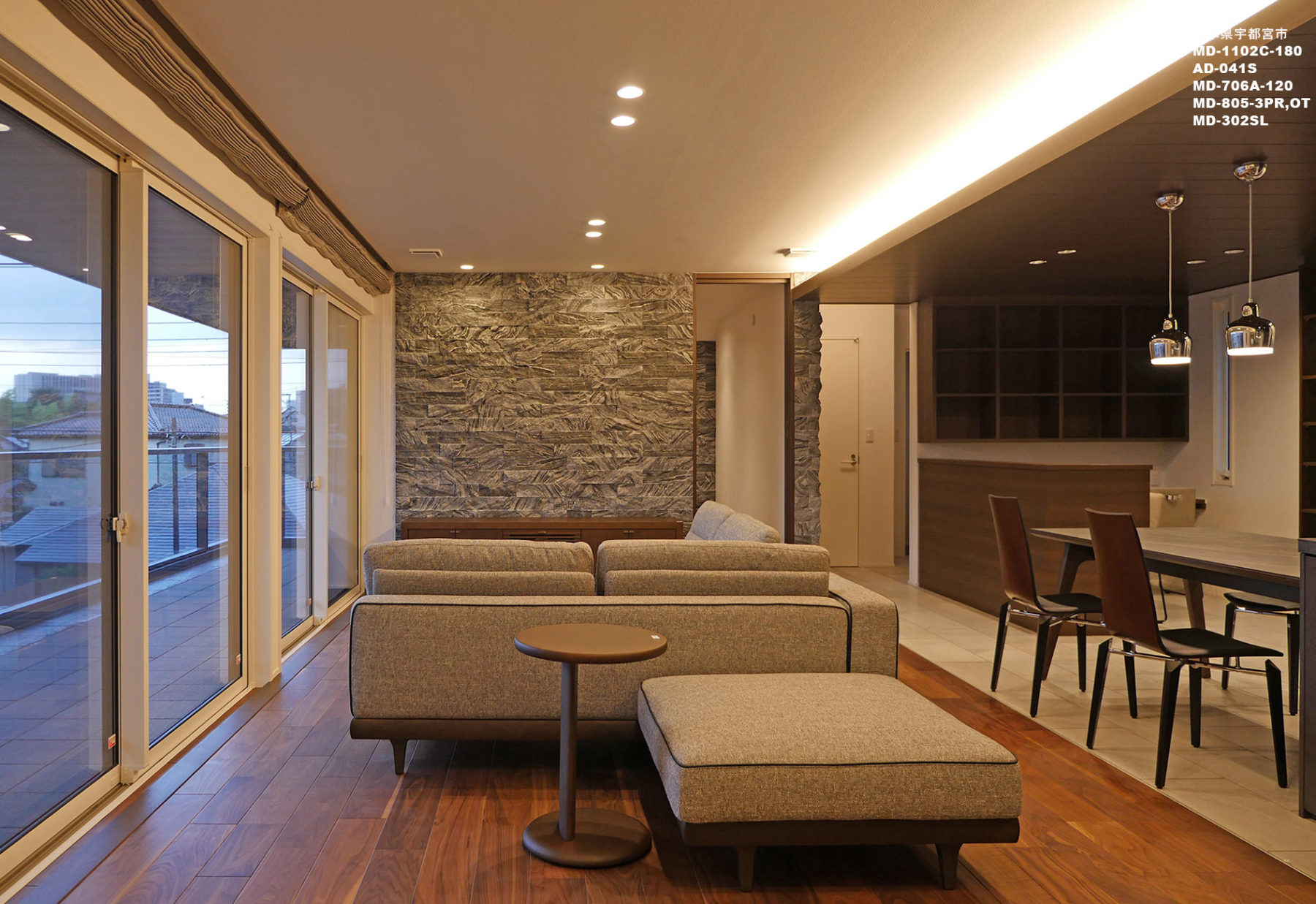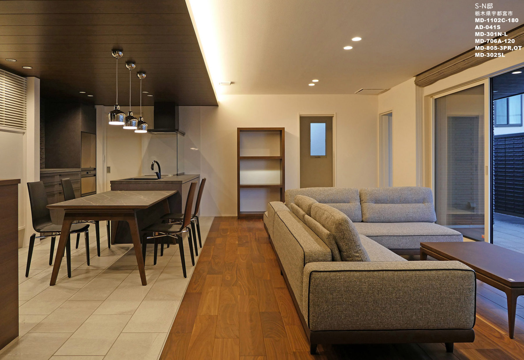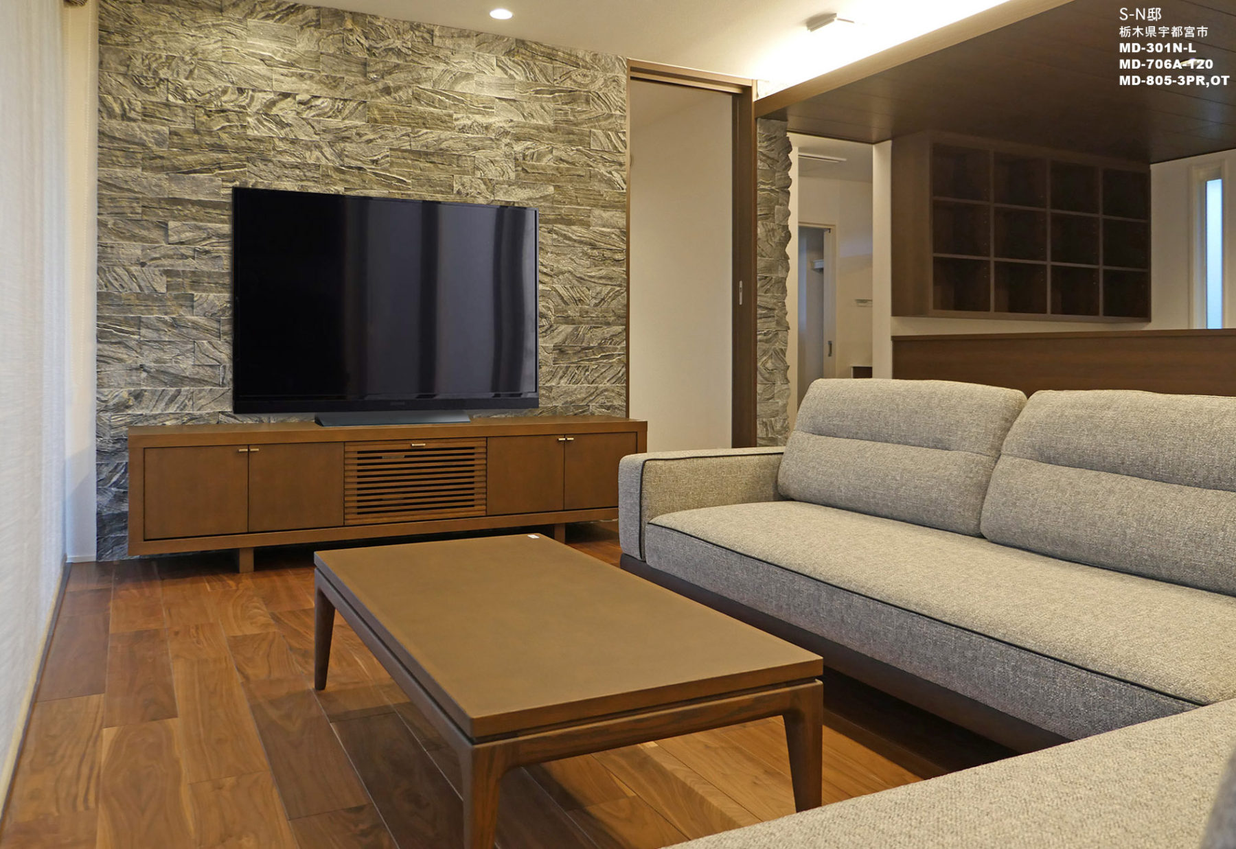 当社製品の採用理由:片袖のソファーの袖高を特注することで、空間のボリュームに負けないL型コーナーソファーのレイアウトが可能。照明付の飾り棚も共に提案してリビングの装飾性を高めました。