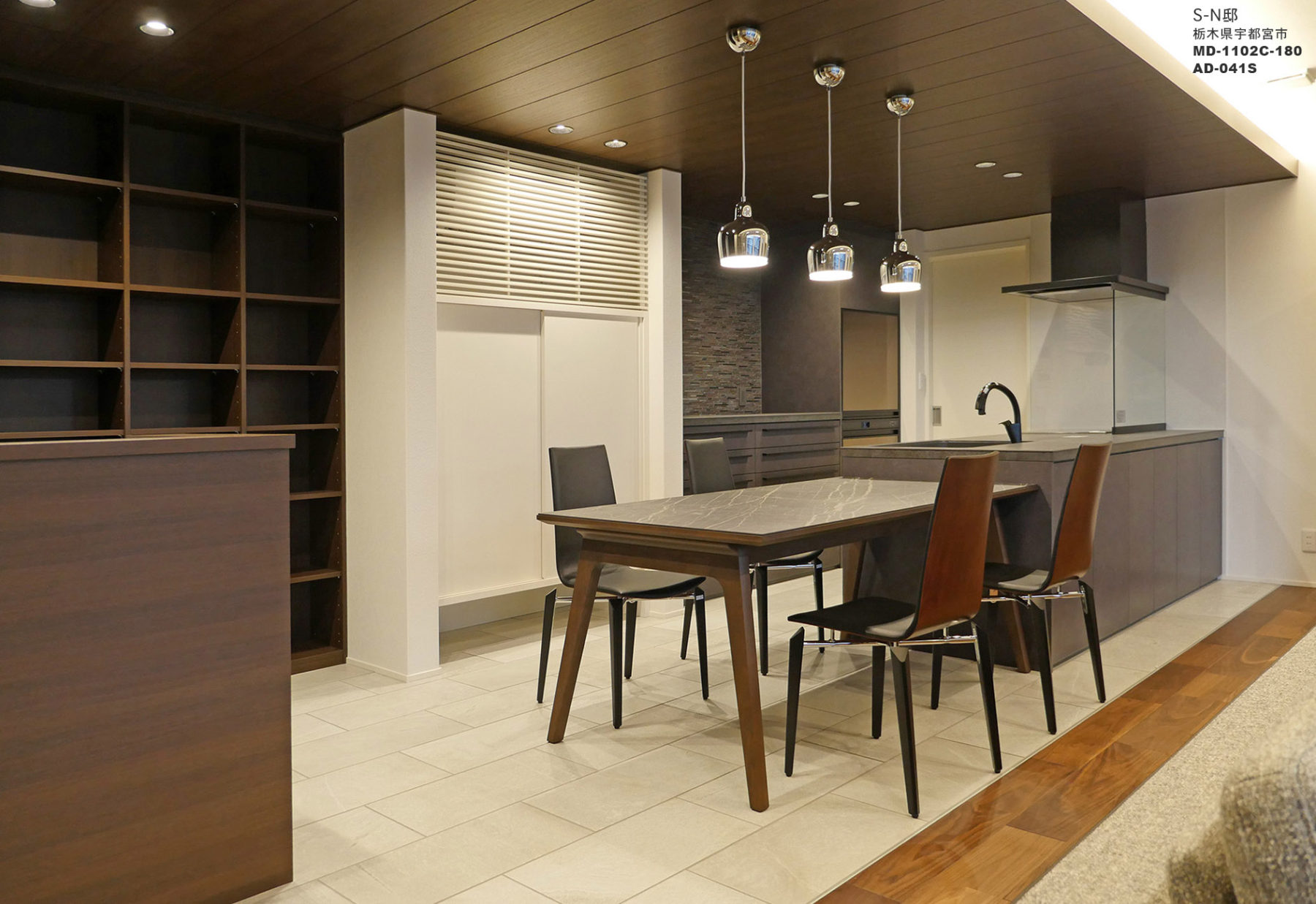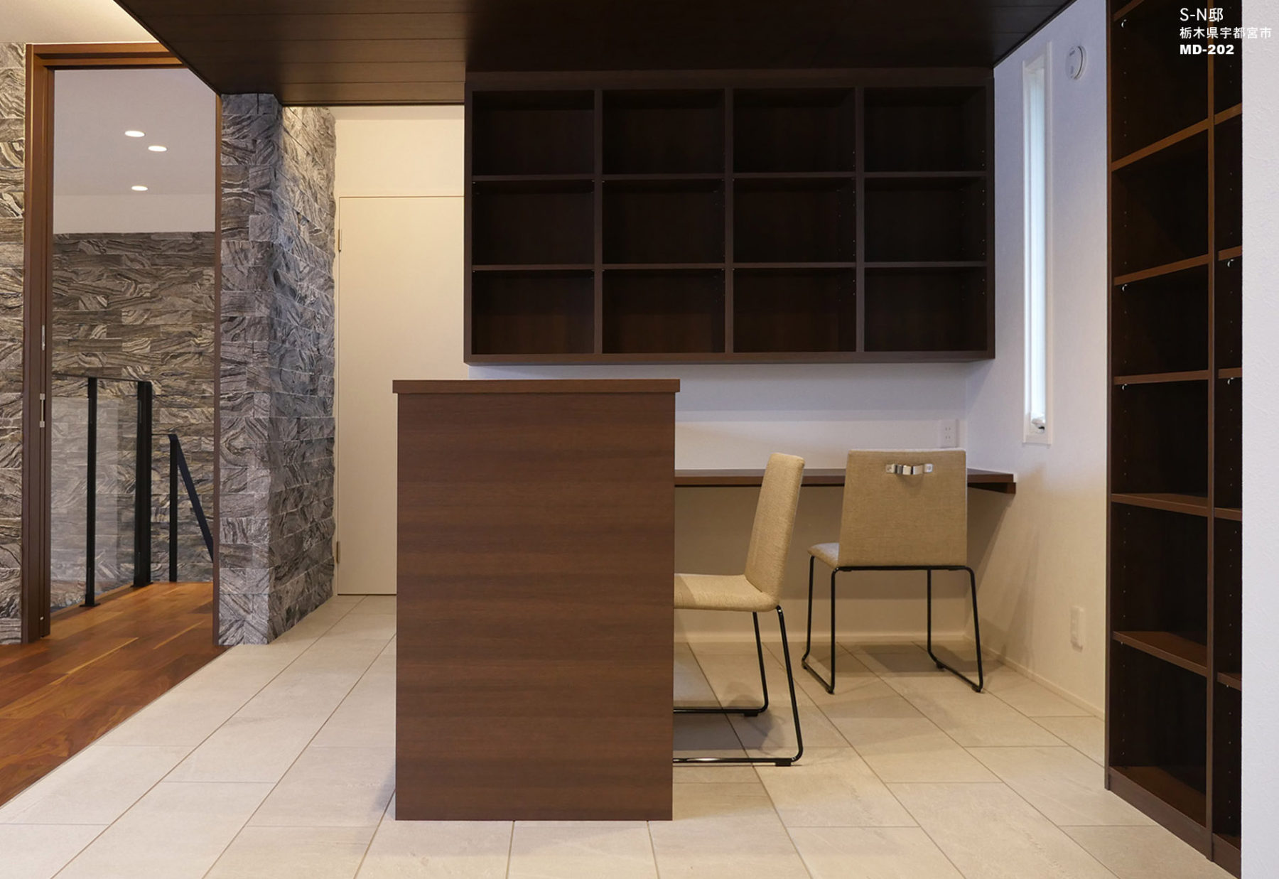 バルコニーに面して開放感あふれる2Fリビングにキッチンとスタディーコーナー、ダイニングを床の仕上げに変化をつけることで、それぞれを心地良いスペースとして独立させる、石貼の重厚感に負けないインテリアのエレメントを選択する。