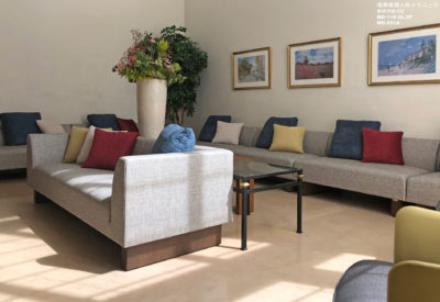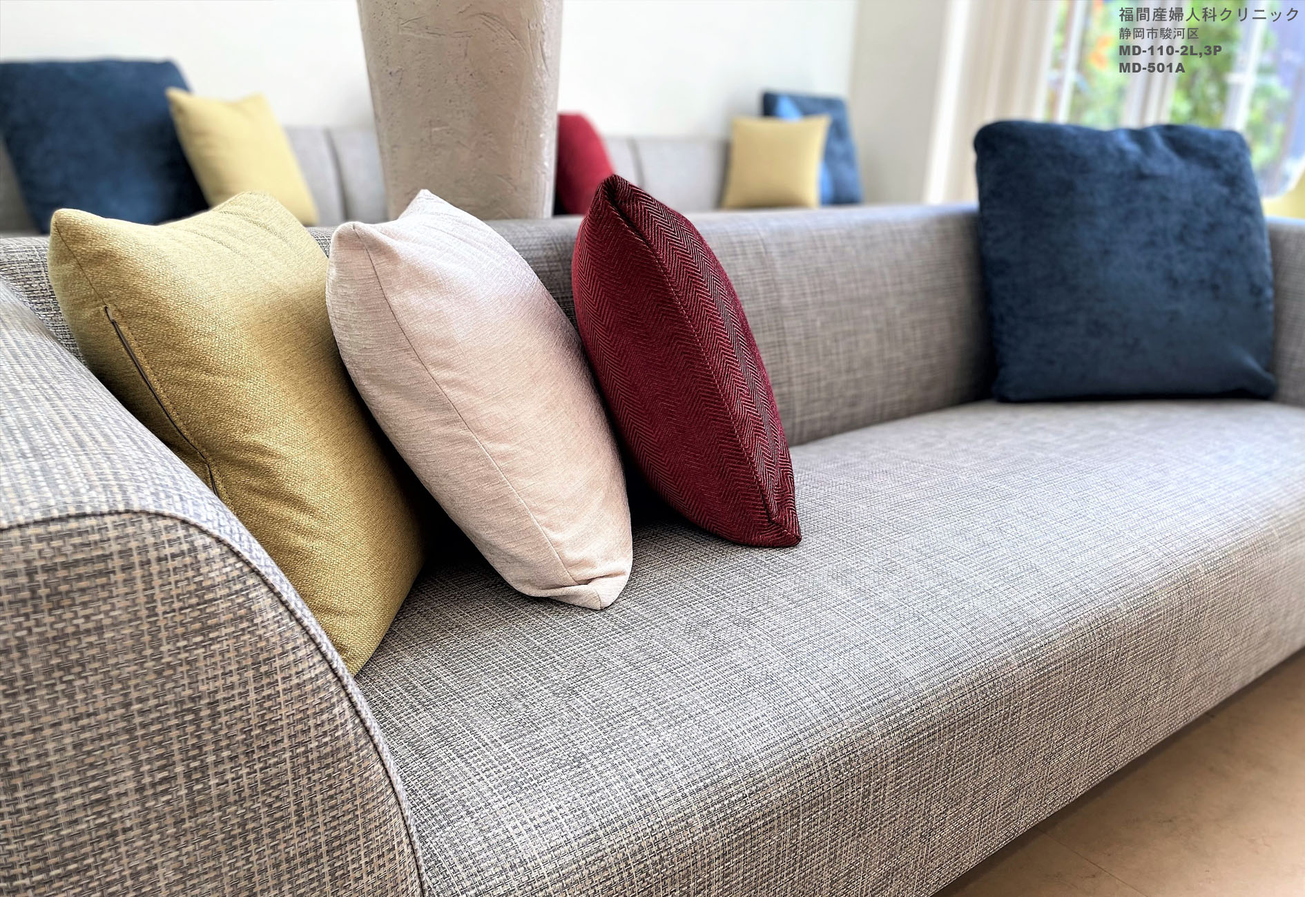 竣工から22年、かなり傷んでしまった待合室のソファ交換の依頼を受けました。家具を選ぶにあたり、産婦人科クリニックの場合はまず機能が最優先されます。