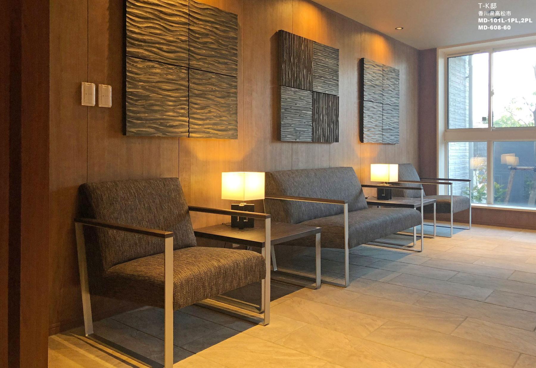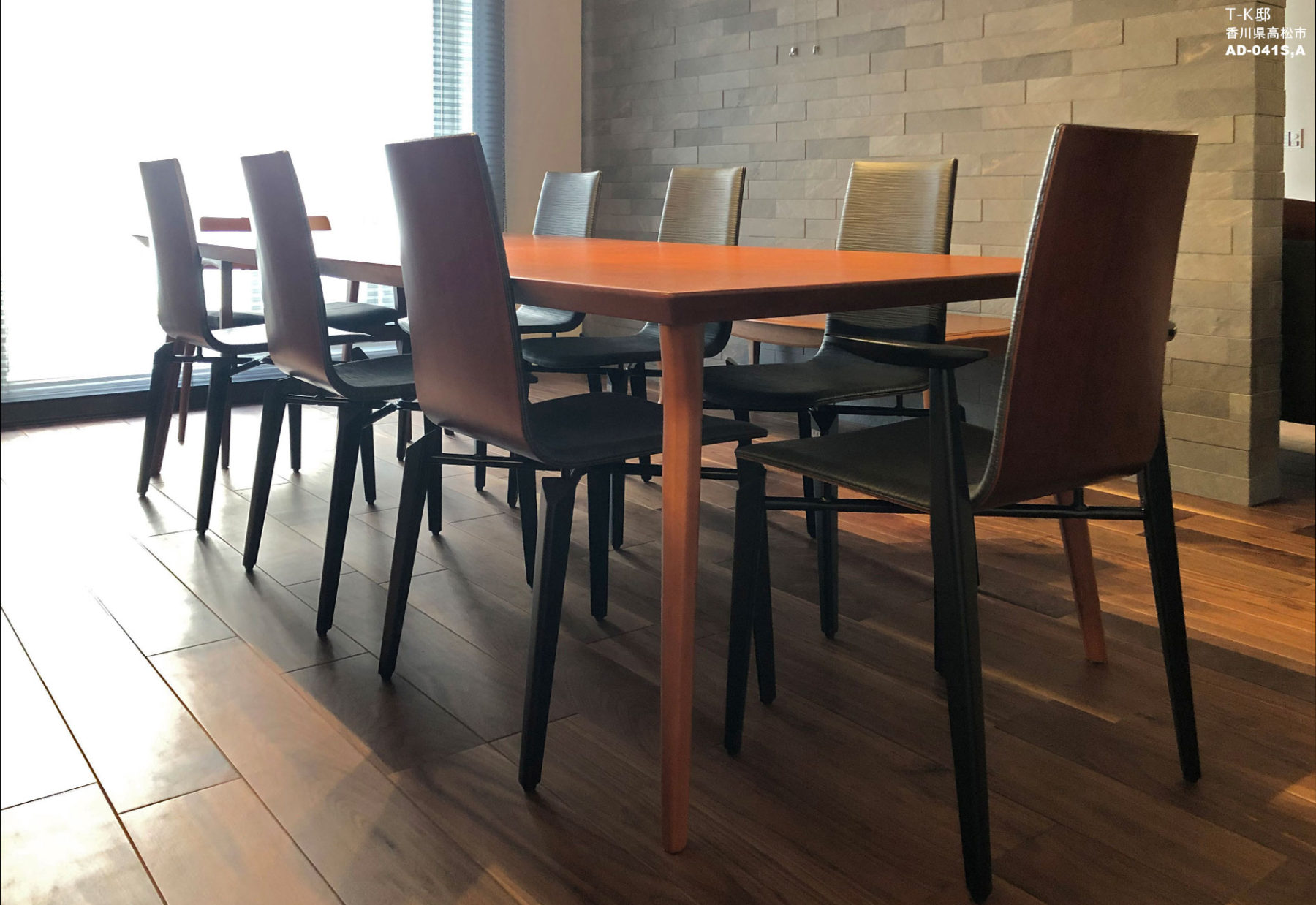納入後の感想:オーナー住宅ダイニングのチェルボⅢは、背中のデザインが非常に美しく、ご提案と同時にとても気に入っていただきまし た。ご家族団欒の場で、凛々しく存在感を示しています。エントランスのパーソナルチェアは程良い硬さ、シンプルで機能的かつ衛生的(抗菌仕様)で、公共の場にとても向いているチェアだと喜んでいただいています。