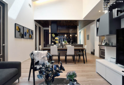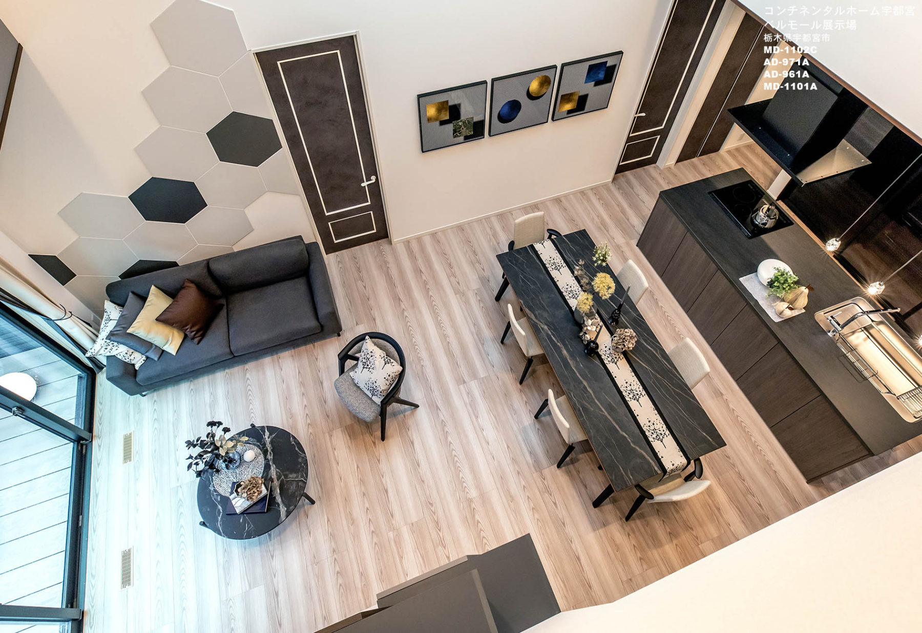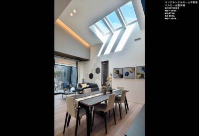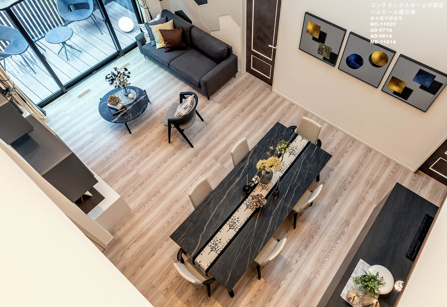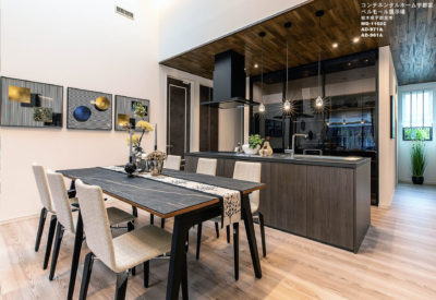 新しい暮らし方 αゾーンの平屋 グラード・アルファ ベルモール展示場.は、未来につなぐ平屋の家です。 インテリアイメージは、NORDICMODERN。北欧プラスMODERN。リビングルームは吹き抜けでダイナミックな空間に、LDK+収納が配置され、スタイリッシュなインテリアにまとめました。2400のダイニングテーブルが印象的な空間に。