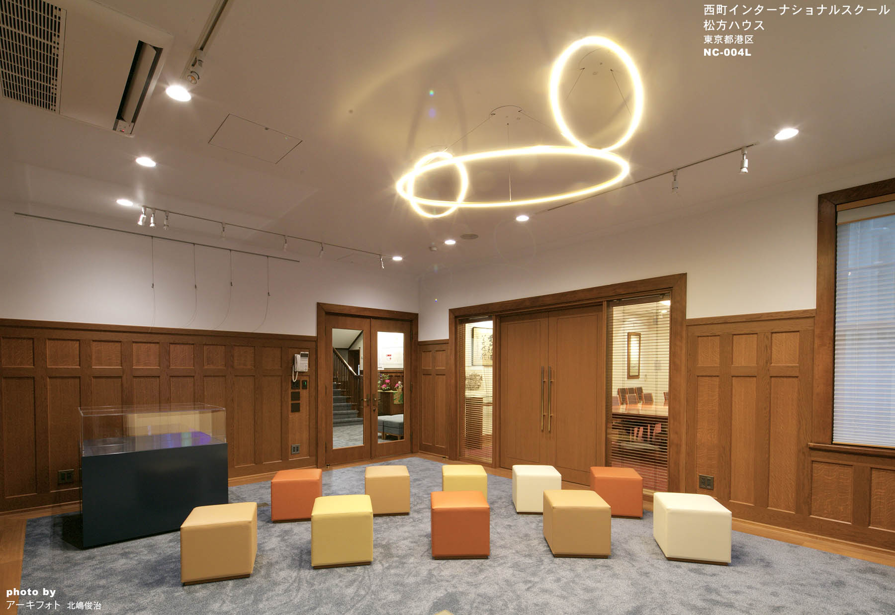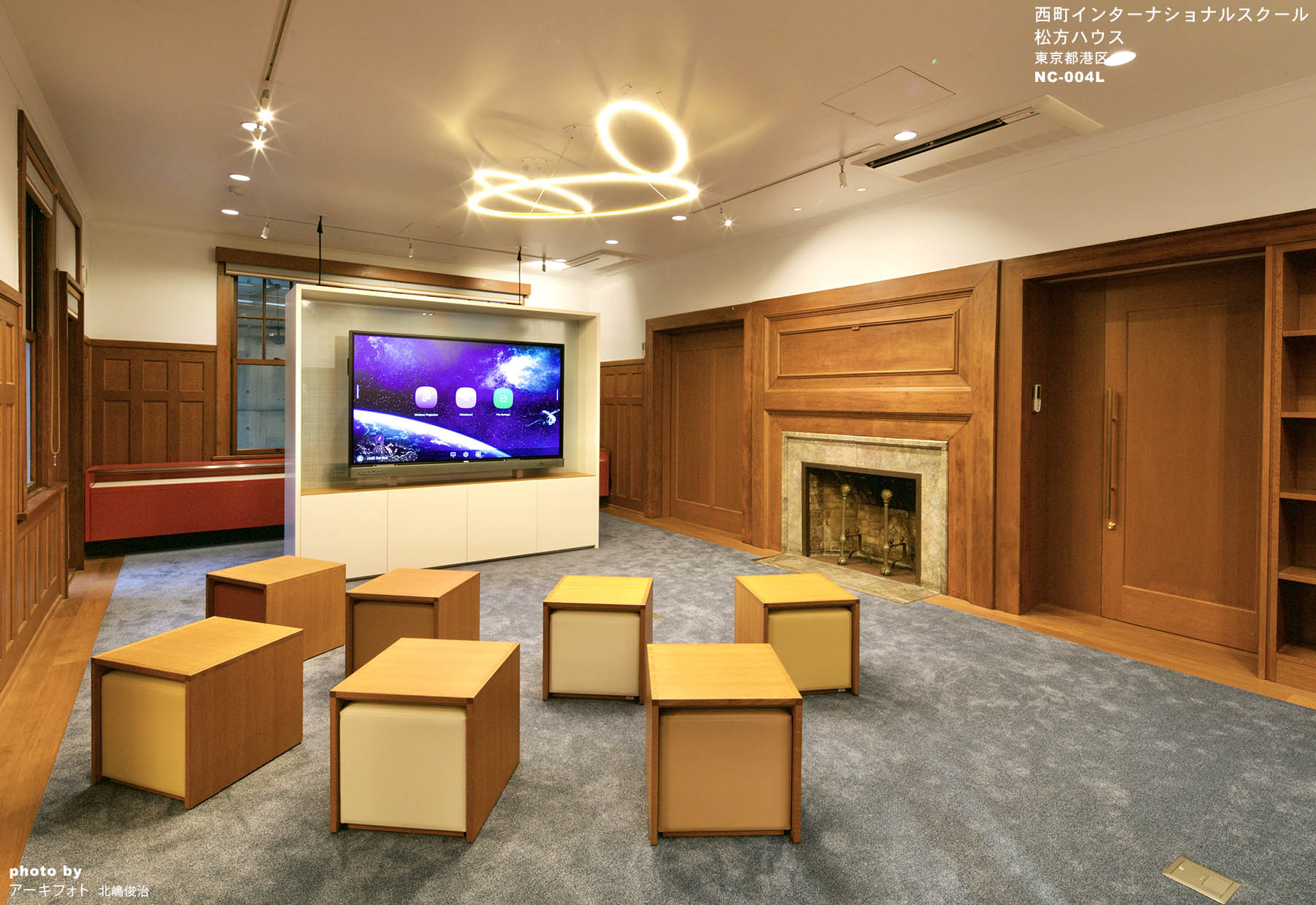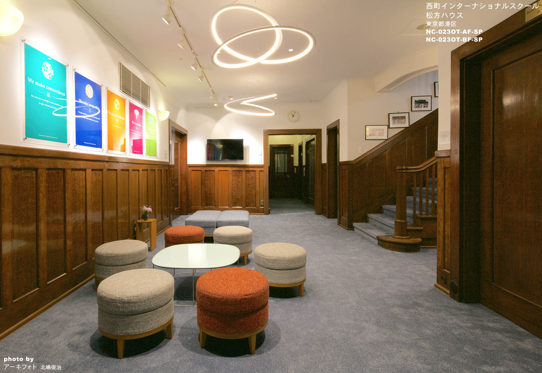 2009年に建物全体の耐震改修が行われた際には、できるだけ竣工当時の姿へ復原することを目標としましたが、12年後のこの度の改修は現代のIT 技術を取り入れながら歴史的洋館としてのヴォーリスのインテリアと現代的で機能的なデザインを融合させることを目指しました。 今回の新しい造作家具と置き家具は、西町で学ぶ子供たちの活動性を重視して既存のインテリアとはむしろコントラストをもたせ、この学校の持つ歴史と同時に国際的で先駆者的な現代の教育を反映させたいと考えました。