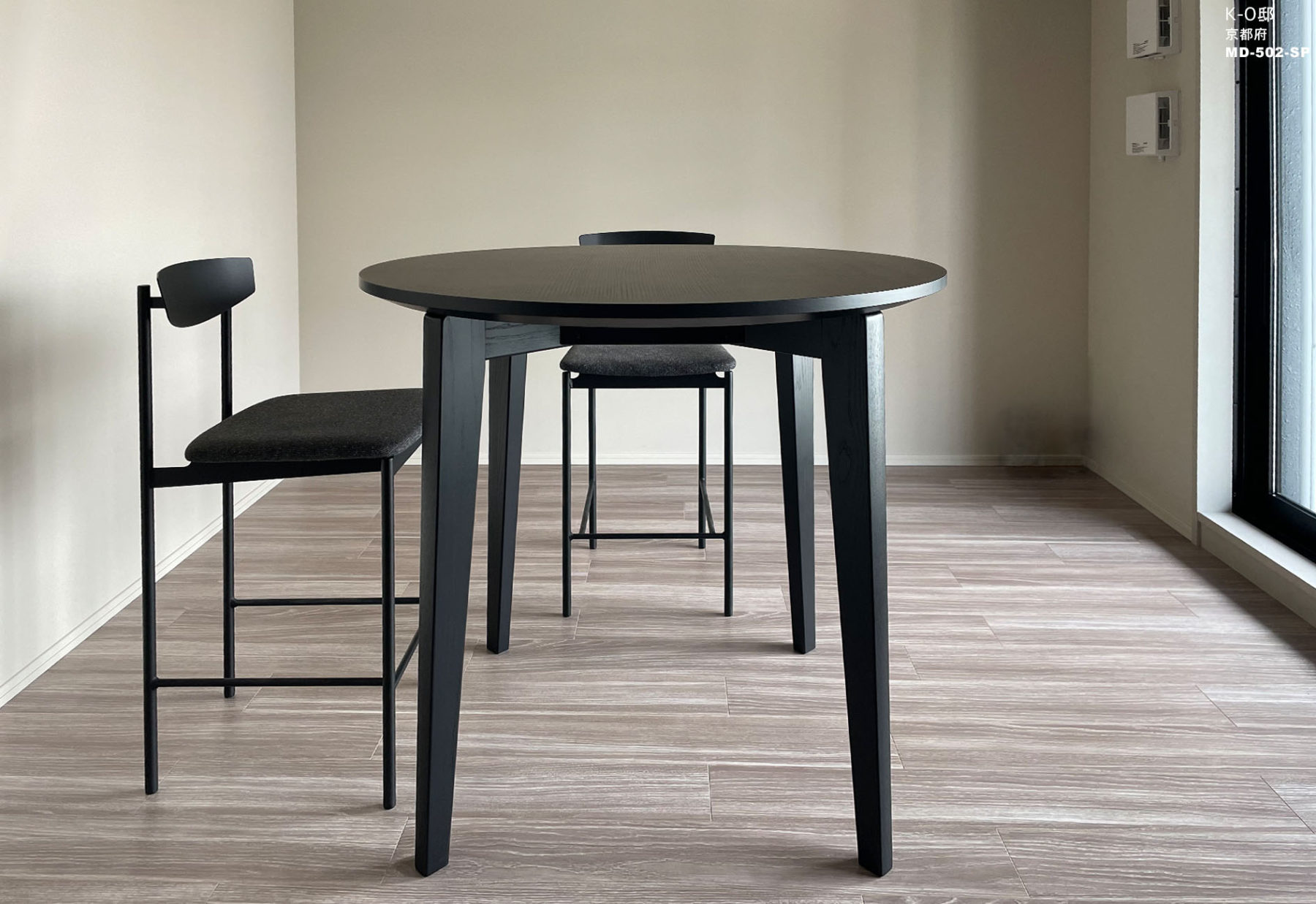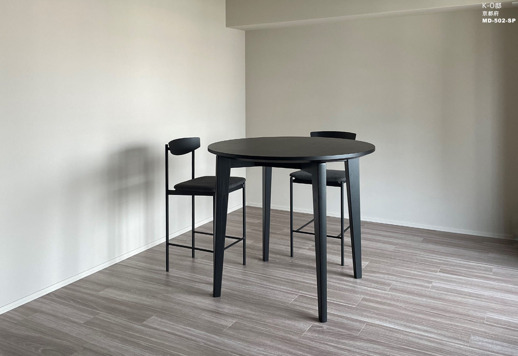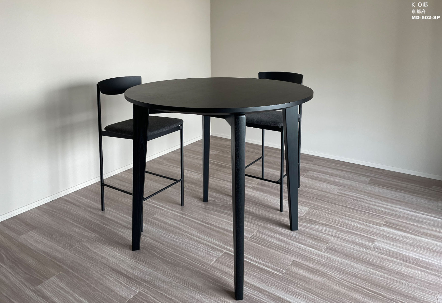 当社製品の採用理由:特注に信頼と実績があったことからショールームを案内し、実際に商品の素材感や品質の良さを確認していただきました。ご希望のイメージに近いMD-502をベースにサイズとカラーを特注仕様でオーダーし、高さのあるテーブルなので、横揺れや耐久性にも配慮して製作していただきました。