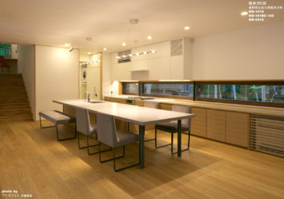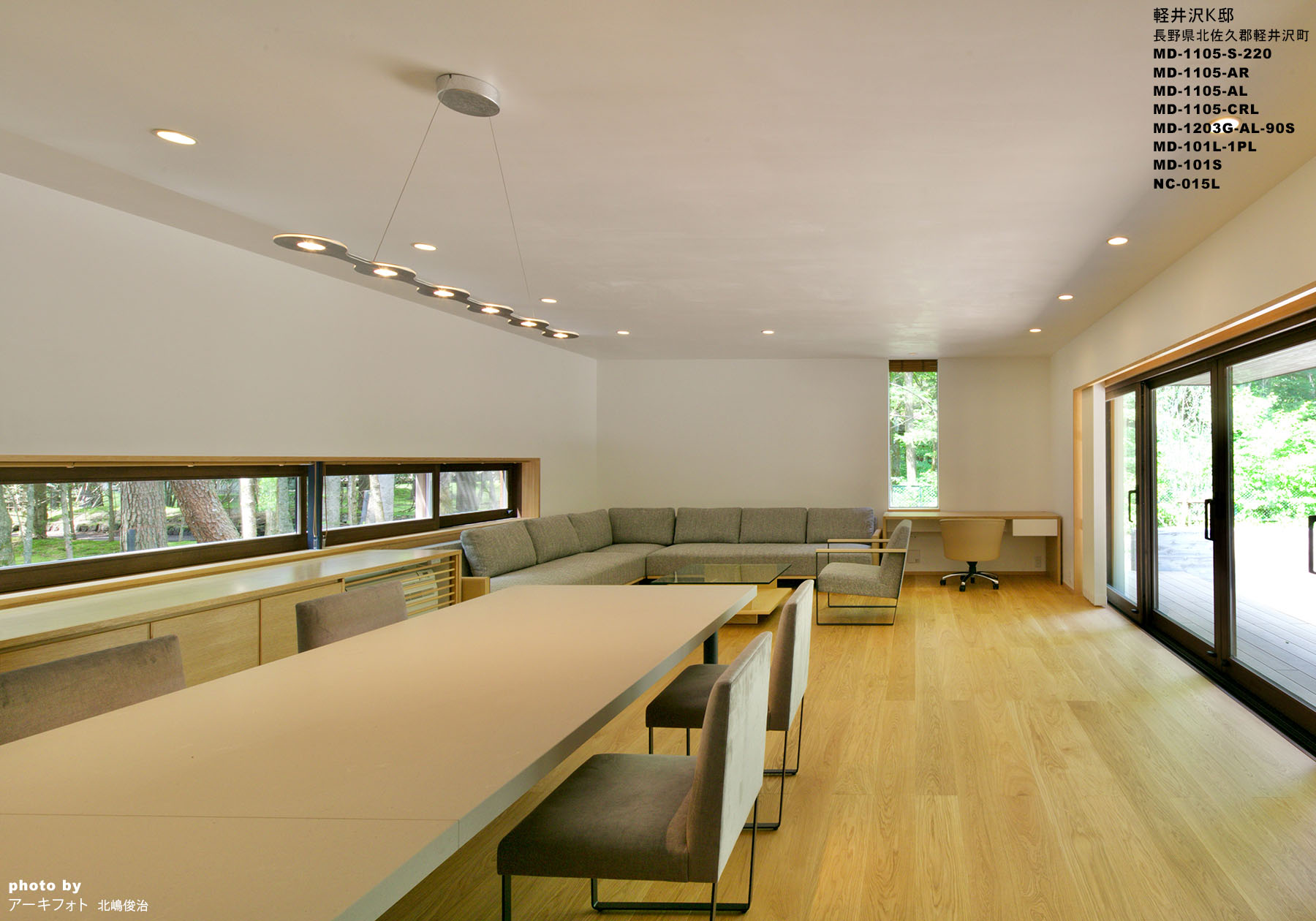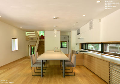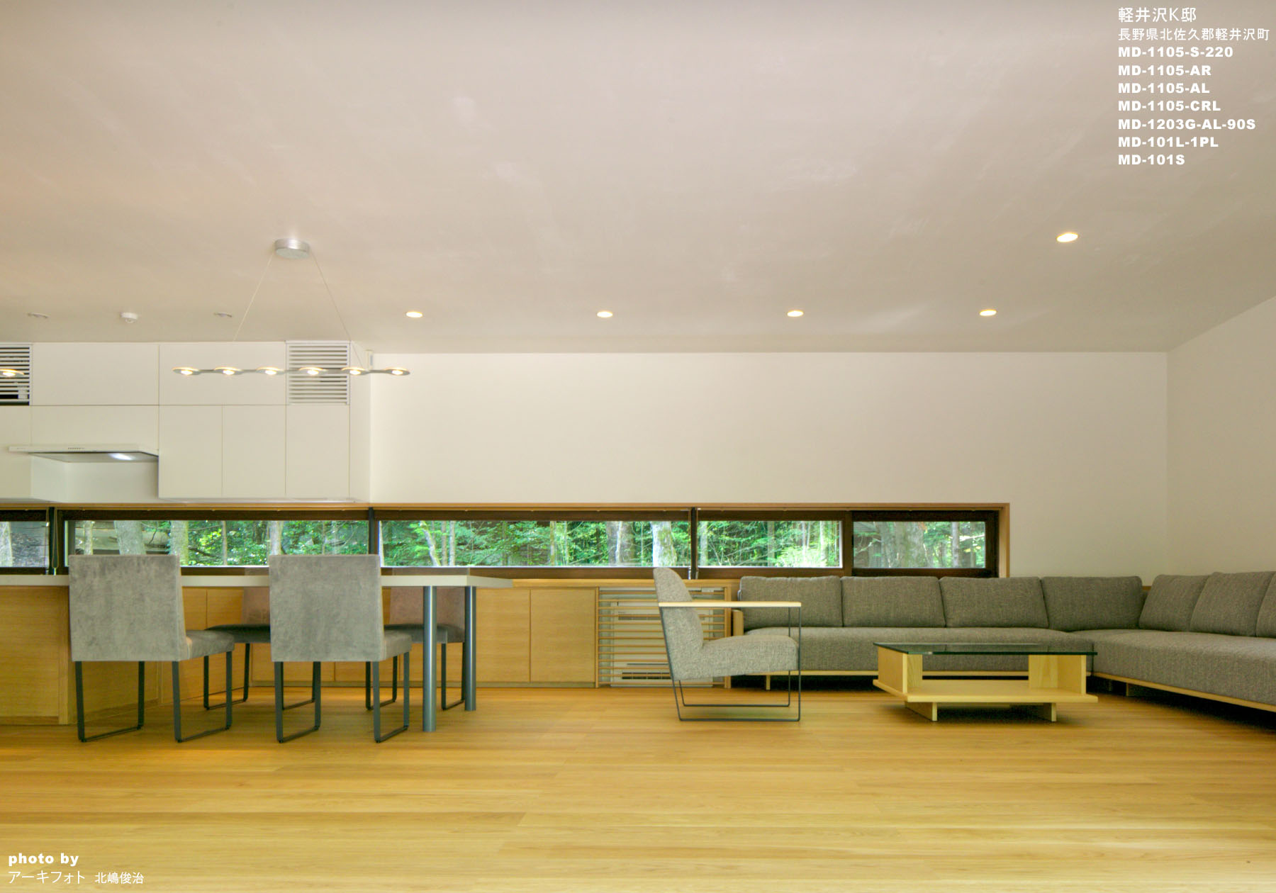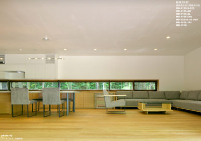 リビングダイニングはこの別荘での家族の活動の中心であり、キッチンカウンターはダイニングテーブルと一体にデザインし、ゆったりとした時間を過ごすためのダイニングチェアとベンチを選定した。キッチンの背面の造作カウンターをそのままリビングのコーナーソファーへと繋げることによって空間に広がりを持たせ、敷地北側の緑を眺めるためのカウンター上部の横長の開口によりリビングとダイニングの一体感をさらに強調している。