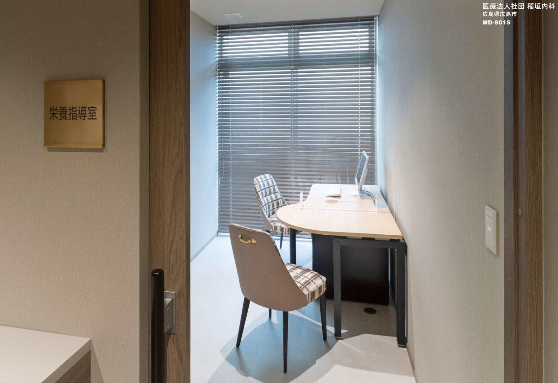 アルコールでの除菌に耐えうる張地でコーディネートが可能で、相談室という来院された方が寛いでカウンセリングを受けられる空間に合わせた柔らかなデザインの椅子として採用されました。