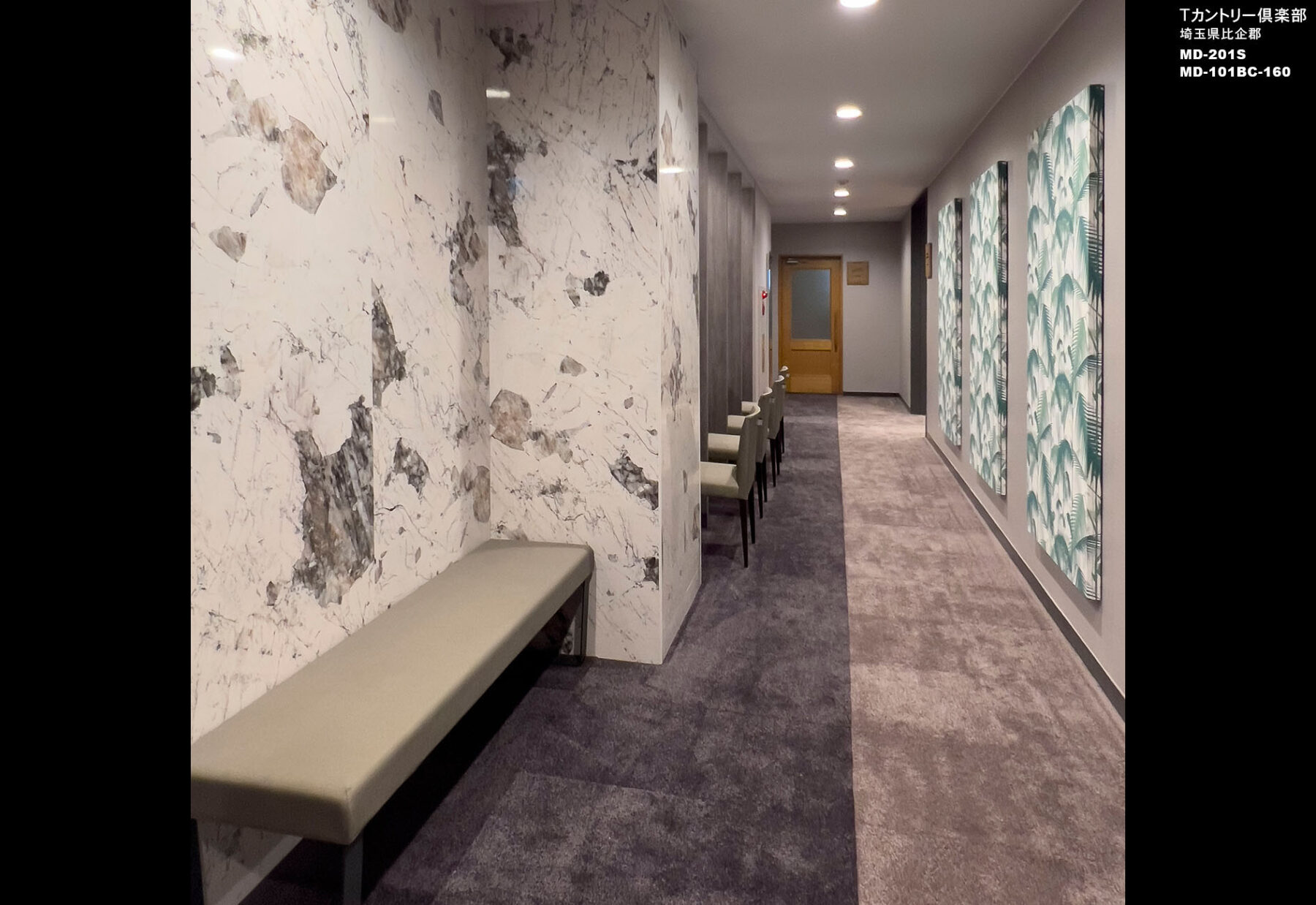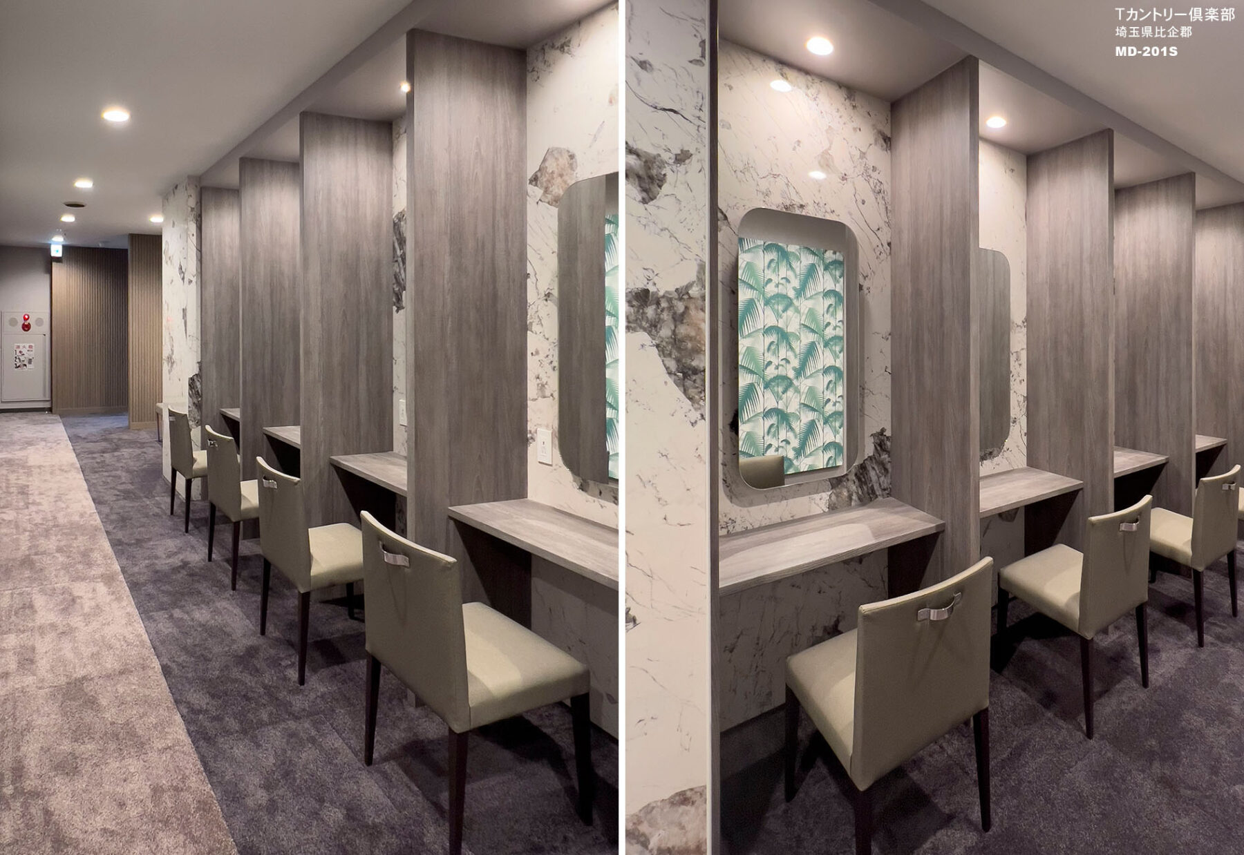 改装前は赤いカーペットの床、白の塗装の壁という単なる通路であった。ちょうどアルコープがあったのでその部分に化粧コーナーを設け、 プレイ後にメールチェックの場所になる事も考え各ブースにはコンセントとUSBコンセントを取付。大胆な石目の化粧板とリブ材を用いる事で高級感を出し、ゲストやビジターの気分が高揚するように意図しました。