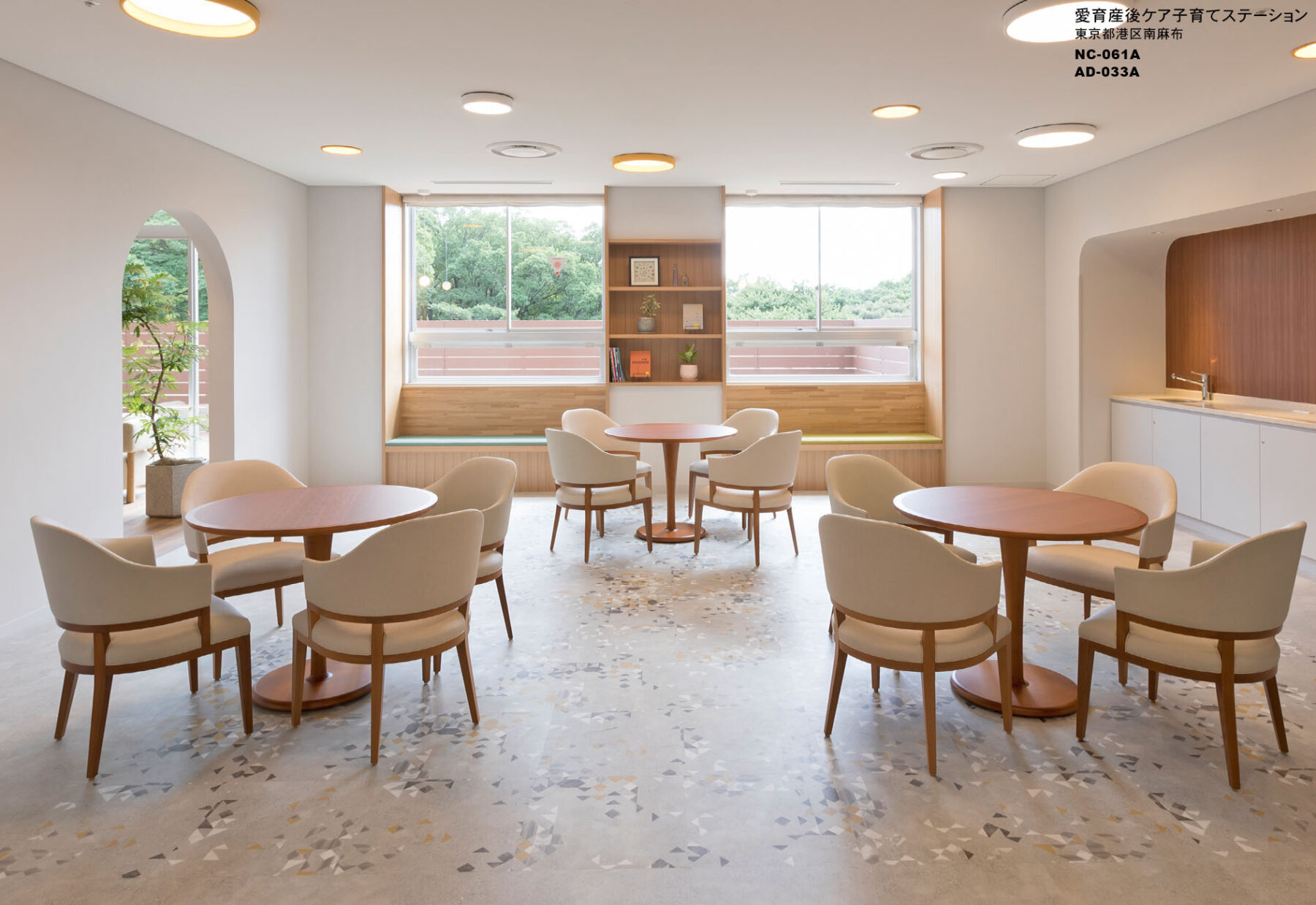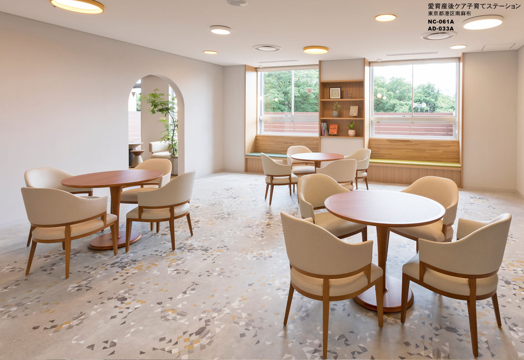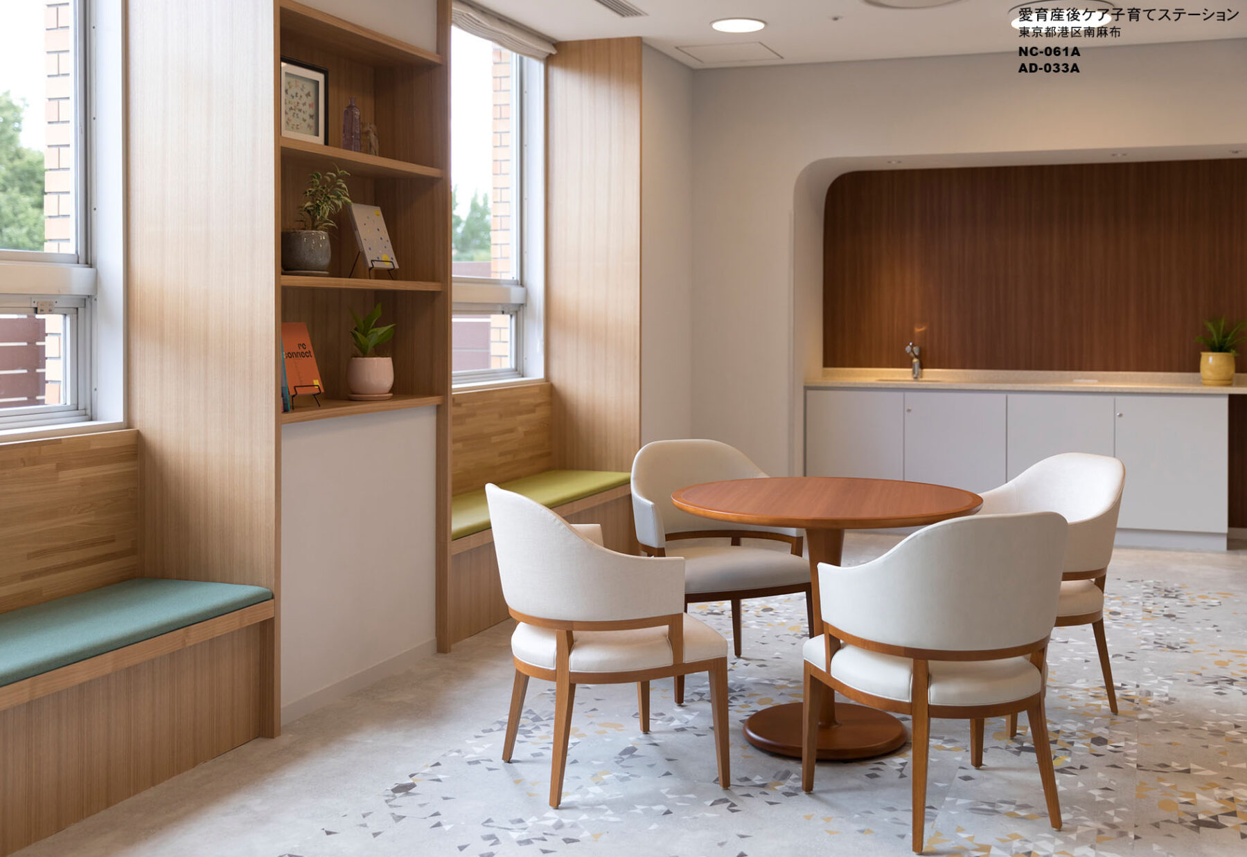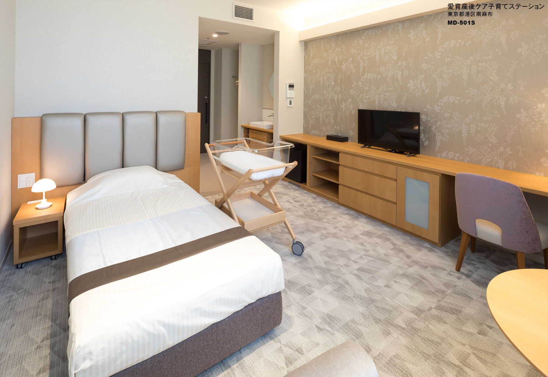 産後間もないお母さんと赤ちゃんが宿泊し、専門的なケアを受けながら心と体を休めるための施設である。共用部は、散歩道をテーマにした、カフェのある広尾の街らしい空間である。一方、宿泊室は、上質感のあるホテルライクでありながら、自宅のようにくつろげる空間を目指し、安全性、清掃性、見た目の美しさだけでなく、お母さんと赤ちゃんの過ごし方や心情に配慮してきめ細やかにデザインした。