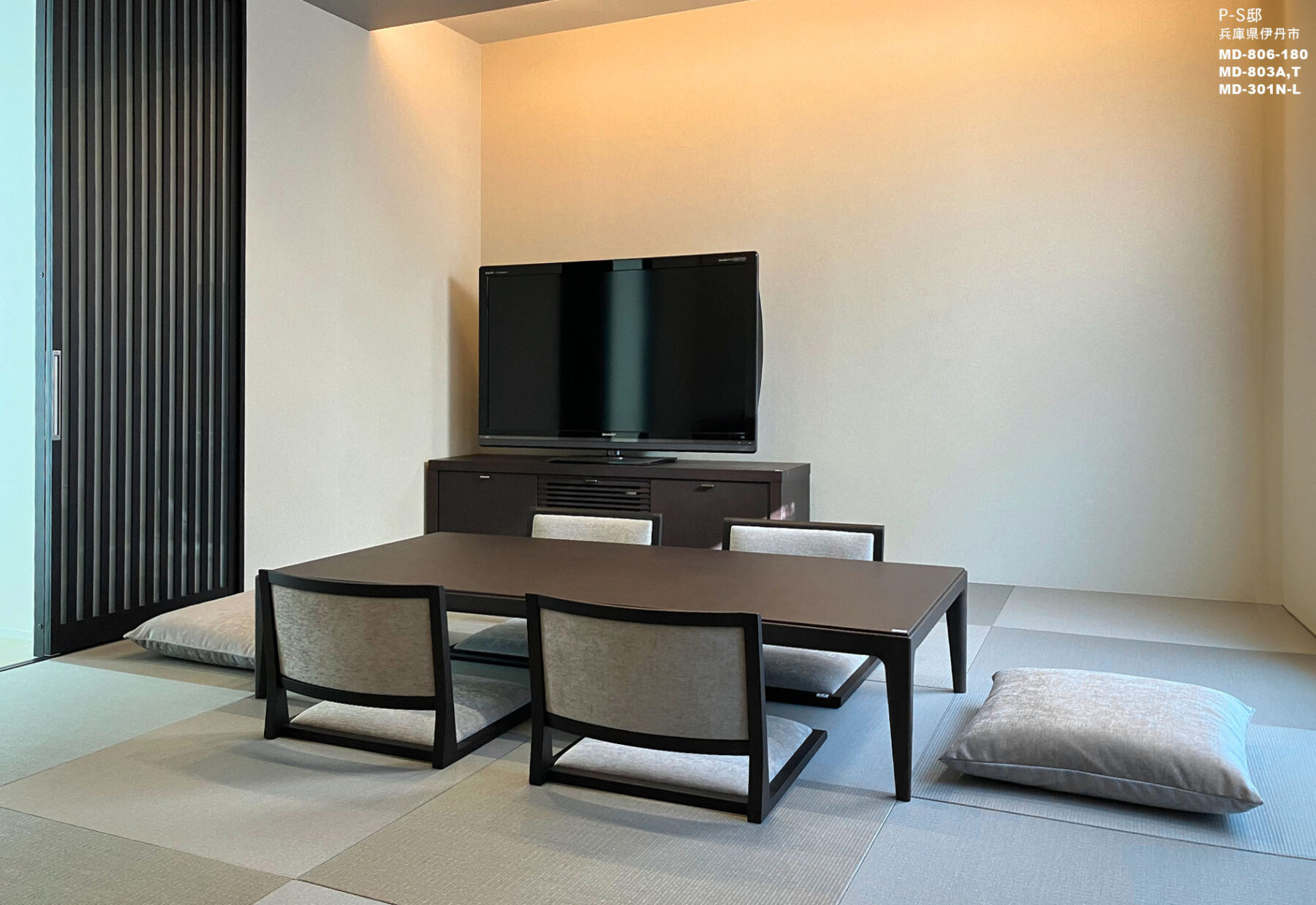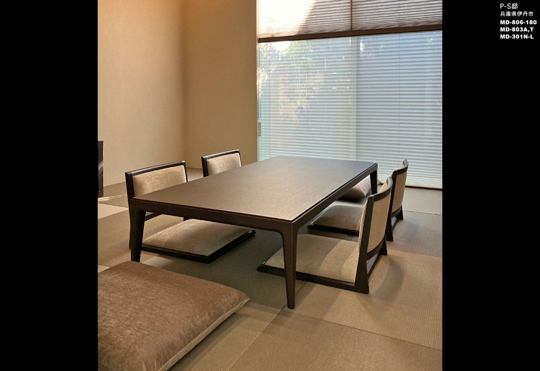 当社製品の採用理由:座卓・座椅子ともに美しくシンプルなデザインと、統一されたグレートーンのカラーが空間に統一感を出します。