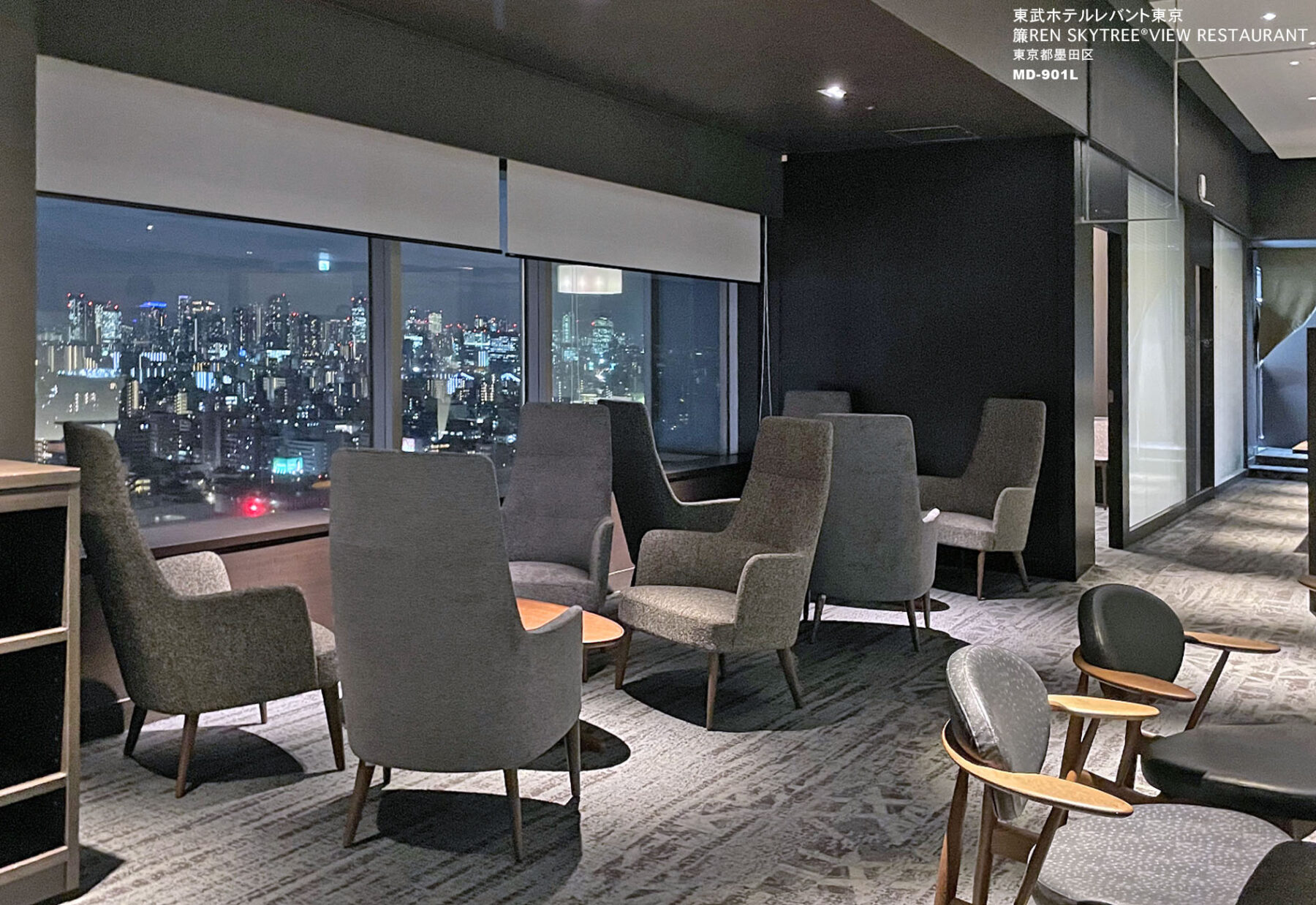 当社製品の採用理由:窓側にはゴージャスさを演出するために敢えてハイバックなラウンジチェアMD-901Lを採用した。窓側で夜景を存分に楽しむことが出来る書斎感のある椅子としてピッタリである。張地をダークグレーにしたことでヴォリューム感を抑えることが出来た。