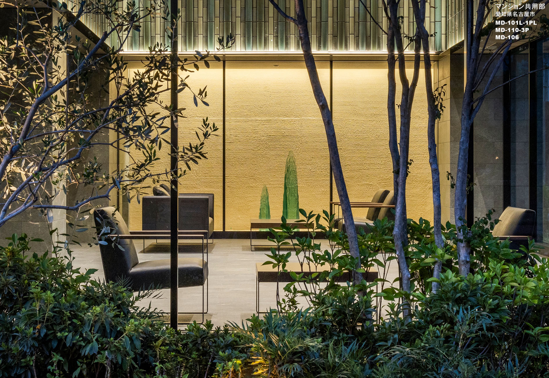 メインファサードを筆頭に線と線でデザインを構成し、直線が織りなす力強さや洗練された直線美を表現しました。二層吹抜のオーナーズラウンジは、瑞々しさを与えるガラスオブジェや竹林をモチーフとしたシャンデリア、シェードから零れる光と影により荘厳で洗練された空間を演出します。