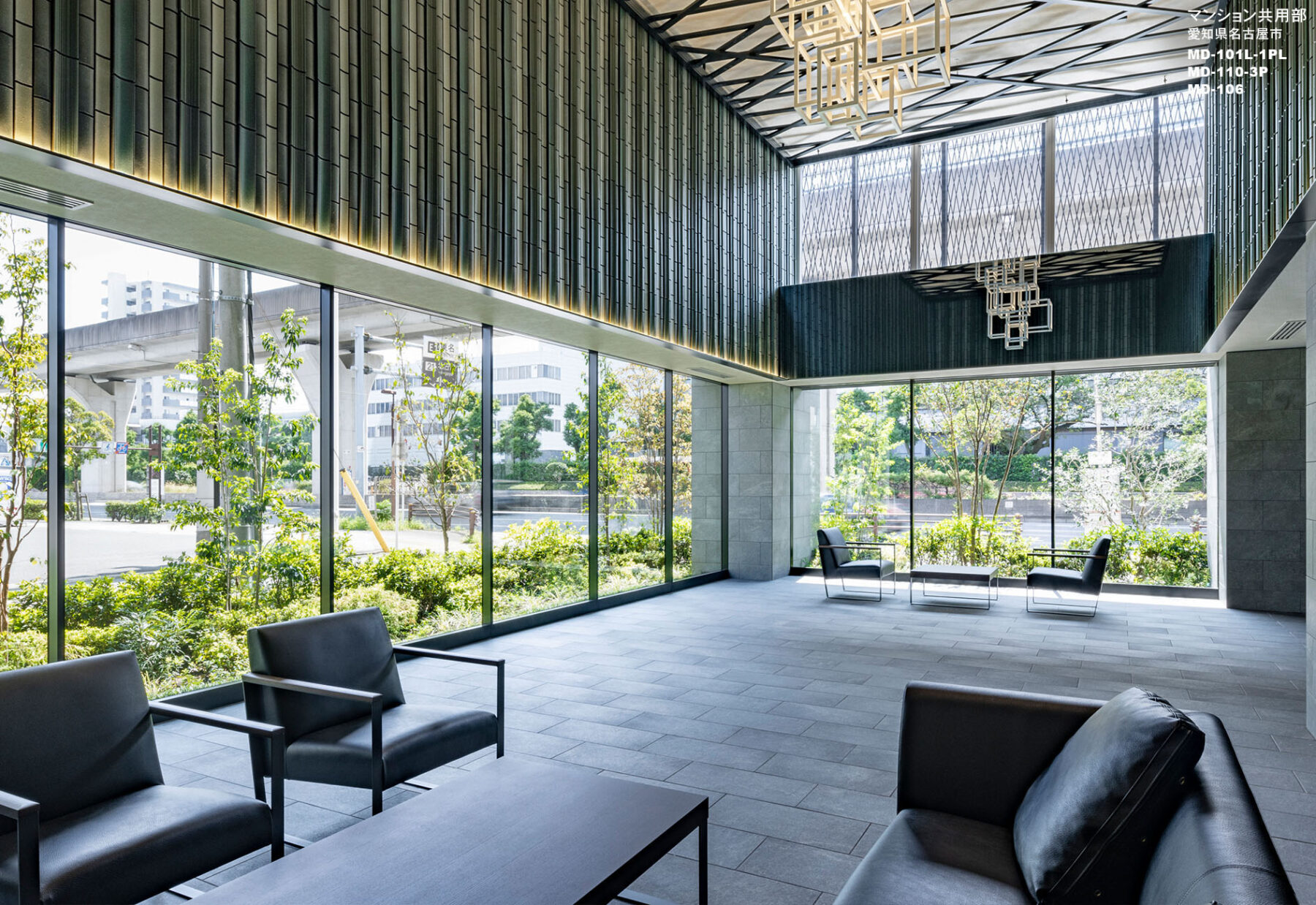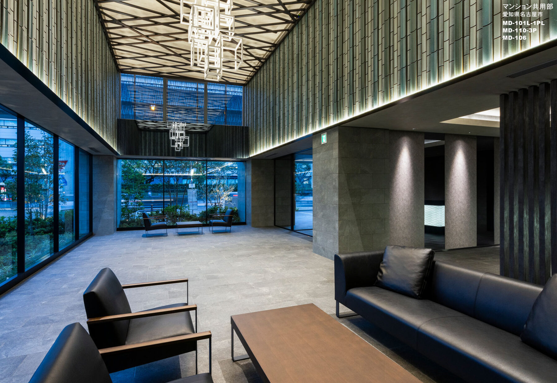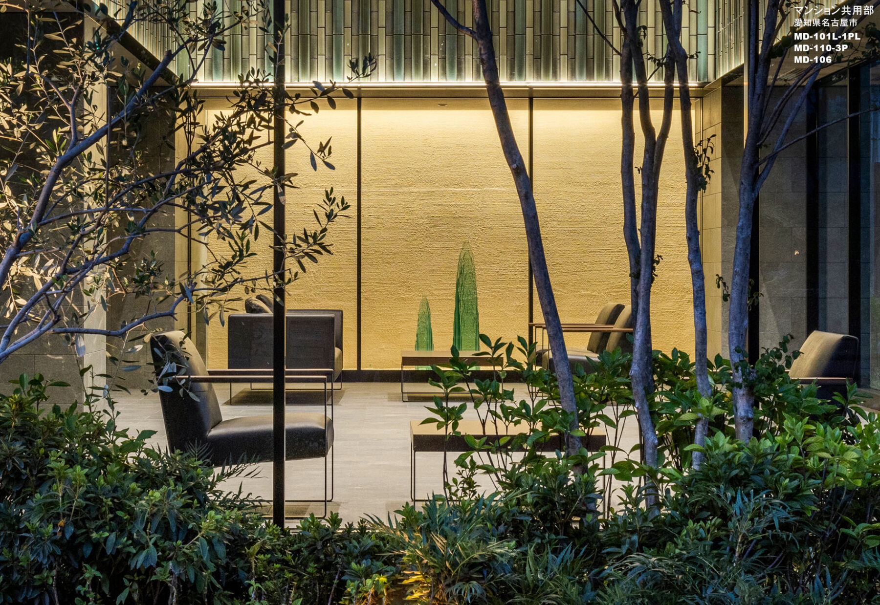 メインファサードを筆頭に線と線でデザインを構成し、直線が織りなす力強さや洗練された直線美を表現しました。二層吹抜のオーナーズラウンジは、瑞々しさを与えるガラスオブジェや竹林をモチーフとしたシャンデリア、シェードから零れる光と影により荘厳で洗練された空間を演出します。