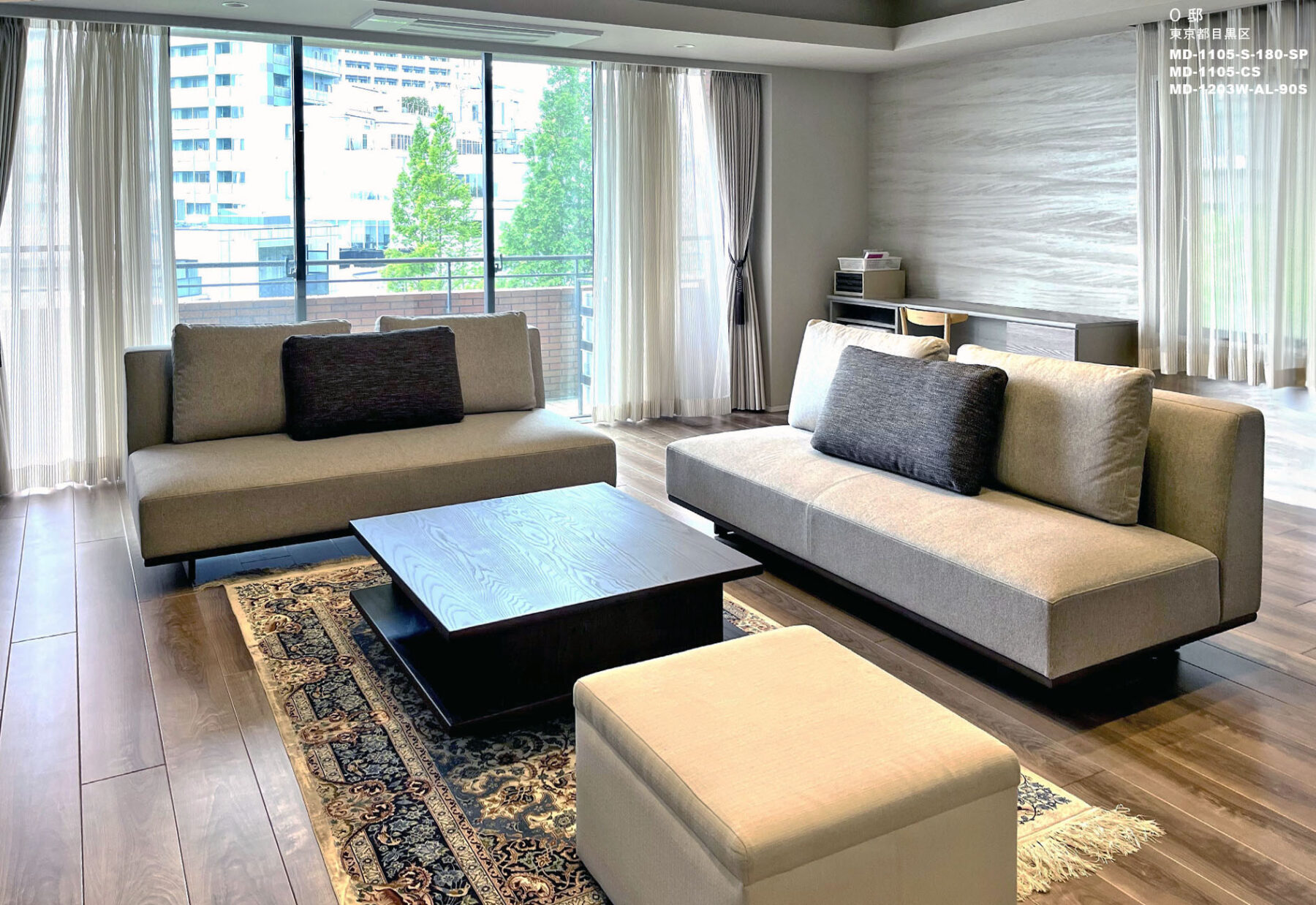 当社製品採用理由:お客様がアームレスのソファをご希望でした。このことと今回のコンセプトに合致する製品を考慮して御社をおすすめし、ショールームを訪問しました。そこでサイズ感、生地や木部の色や質感をご体感いただき、ソファ(背面の高さを少し高くカスタマイズ)、リビングテーブル、パーソナルチェアのご納品となりました。