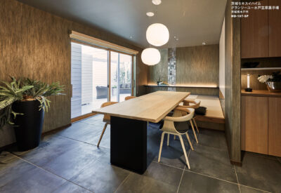 床は金属のような鈍い光沢とくすんだ色合いのタイル、壁にはレザーを彷彿させるステンレスタイルの空間に木目が綺麗な天板とブラックの脚のテーブルでコンセプト通りの和室に仕上がりました。