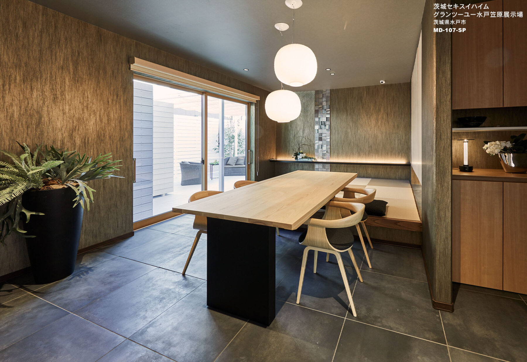 床は金属のような鈍い光沢とくすんだ色合いのタイル、壁にはレザーを彷彿させるステンレスタイルの空間に木目が綺麗な天板とブラックの脚のテーブルでコンセプト通りの和室に仕上がりました。
