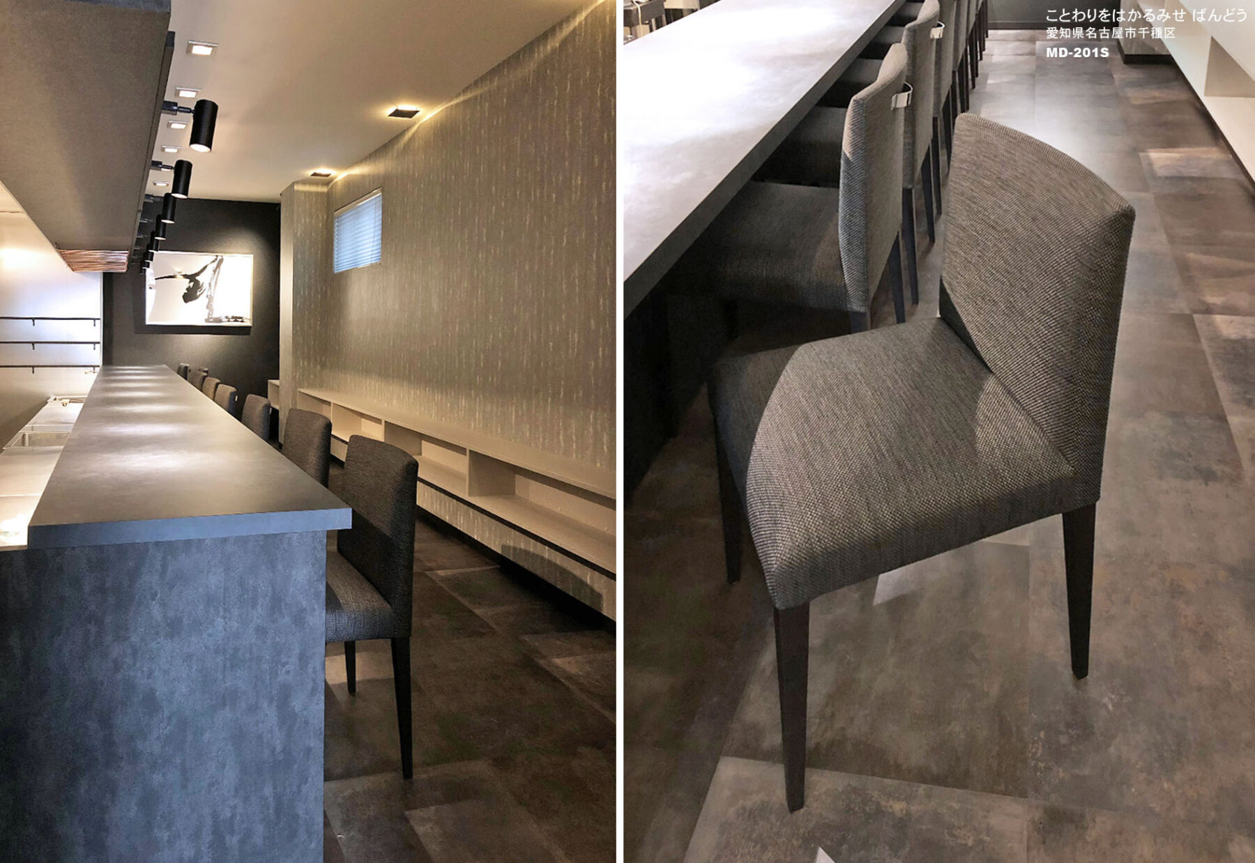 当社製品の採用理由:以前はハイカウンターチェアだったが、お客様の安全性ともっと寛いで料理を愉しんでもらいたいというオーナー料理人坂東氏のご希望で床を上げるリフォーム。その際にMD-201サイドチェアオプションハンドル付きを採用させていただきました。