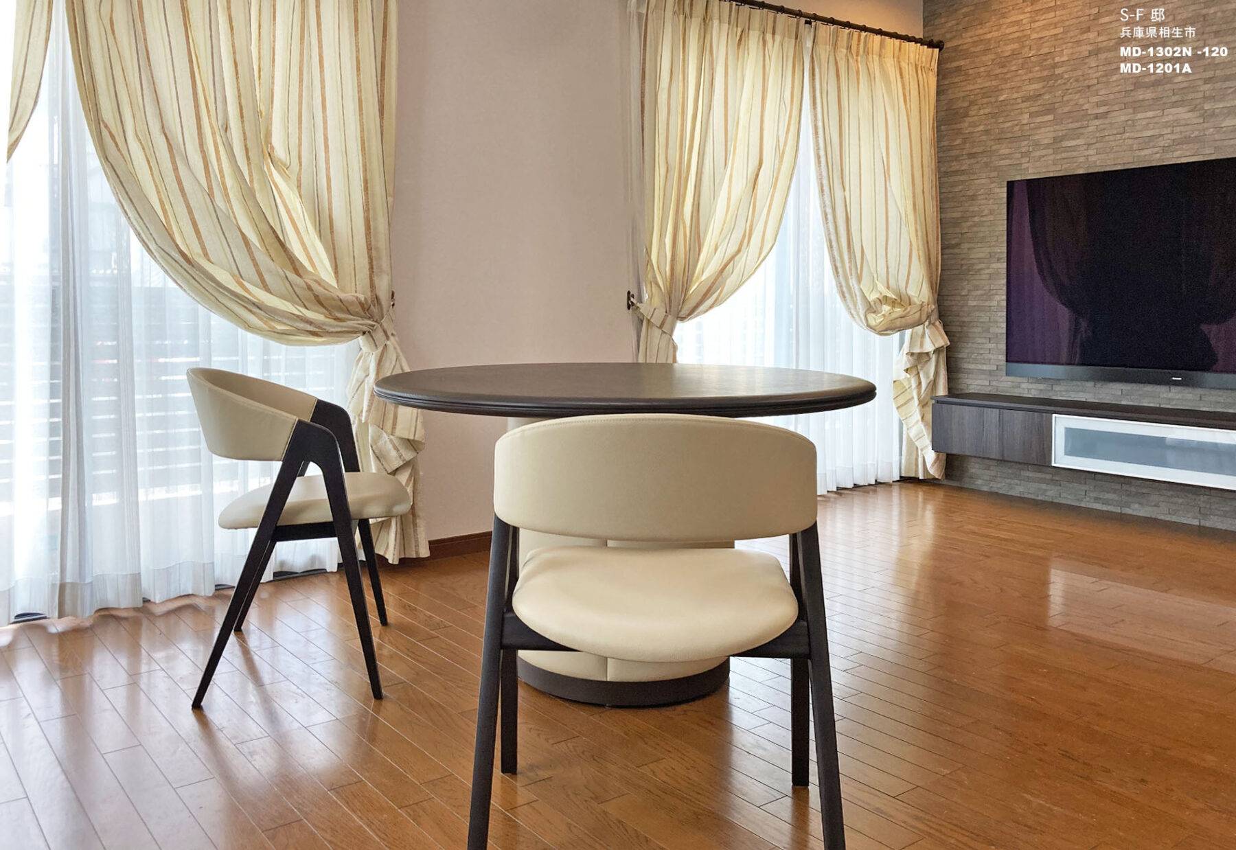 リビングのリフォームのお客様に、LDKのエコカラット・壁掛けテレビに合わせてダイニングセットをご提案しました。今までは長方形のダイニングテーブルをお使いでしたが、どこに座っても会話しやすく距離も保てる丸テーブルをコーディネートしました。