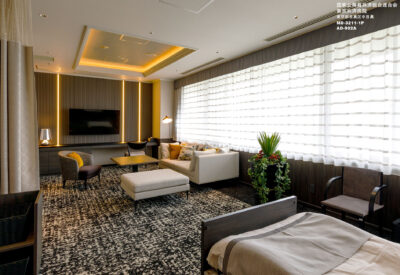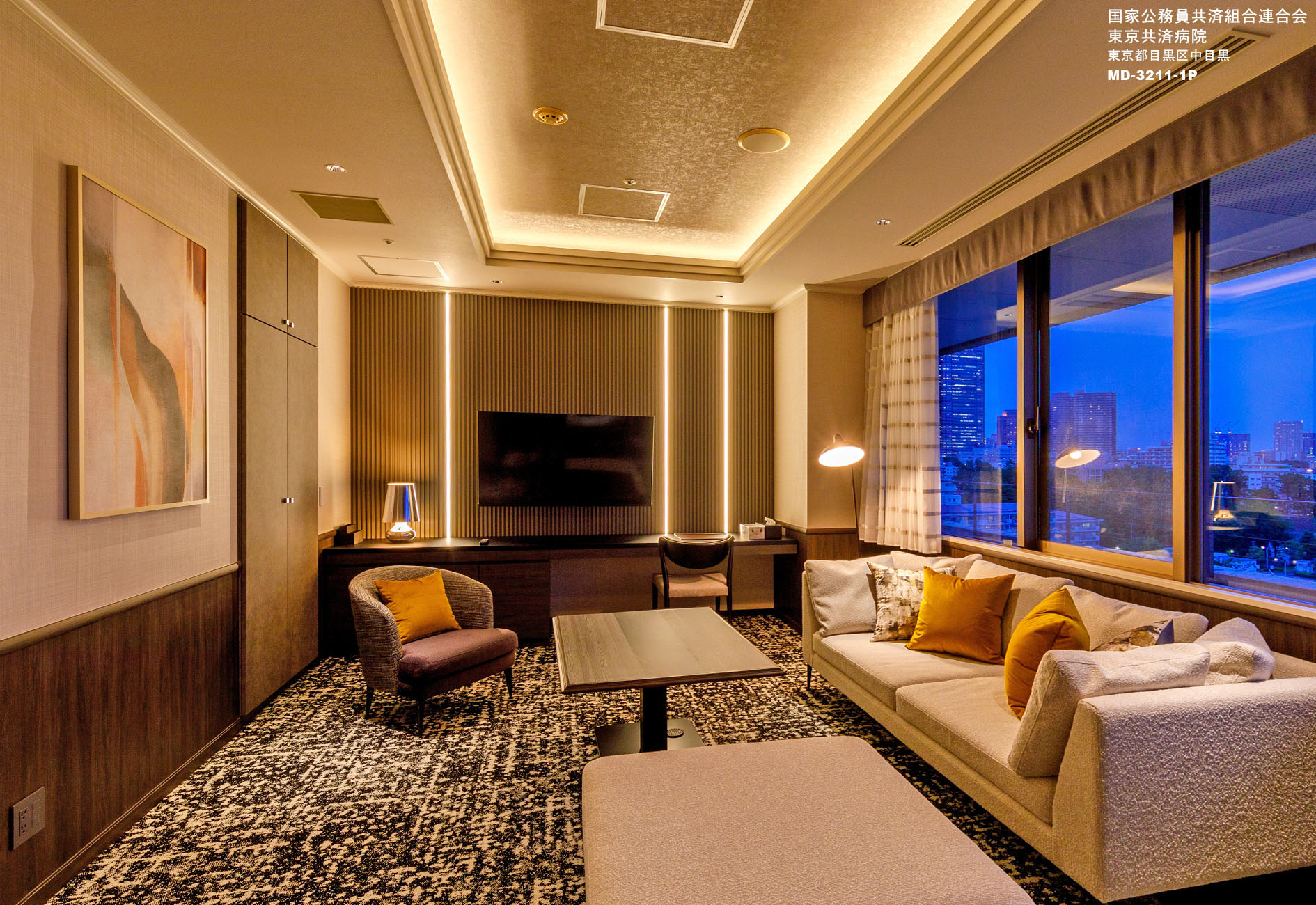 都会的なエリアに位置する病院の高層階にある特別室は、照明効果を活かしたアーバンラグジュアリーなインテリア空間へと生まれ変わりました。グレイッシュでシャープな色合いの内装に、エレガントな家具やファブリックを用い、落ち着きのある療養空間に仕上がっています。