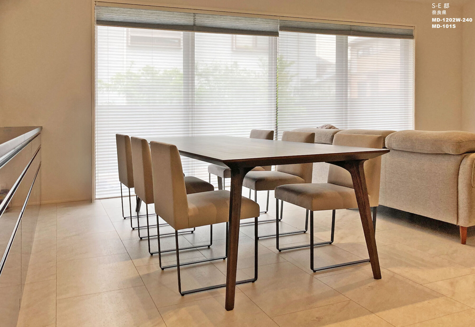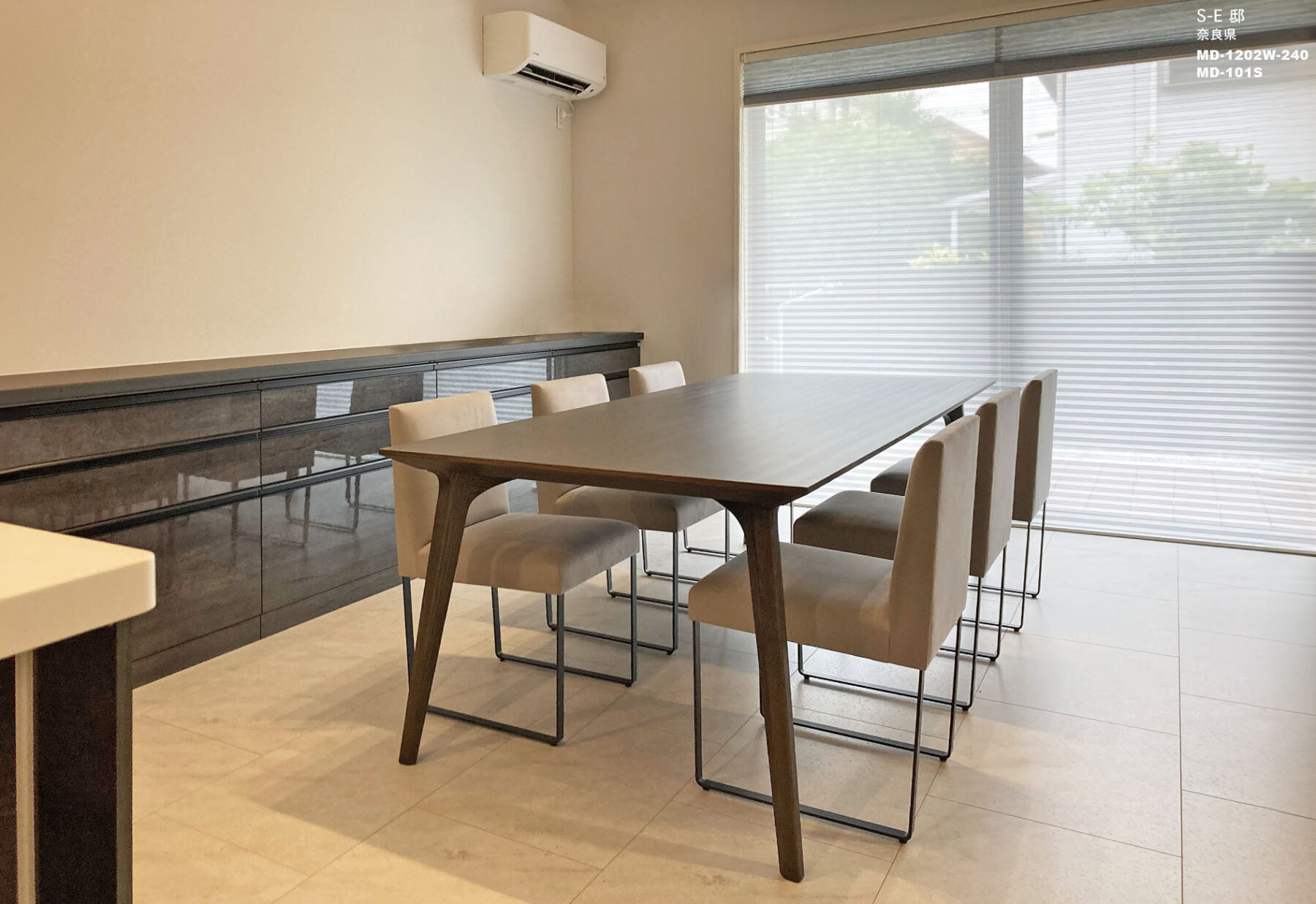 当社製品の採用理由:白色の空間にアクセントになる黒色のダイニングテーブルとチェアを探していました。テーブルは、ラインがきれいなデザインで黒色でも重たい印象にならないので採用させていただきました。チェアは座り心地がよく黒色のスチール脚が空間を引き締めて、とても空間に合っています。また、施主様ご要望の傷に強いチェアの張地も喜ばれています。