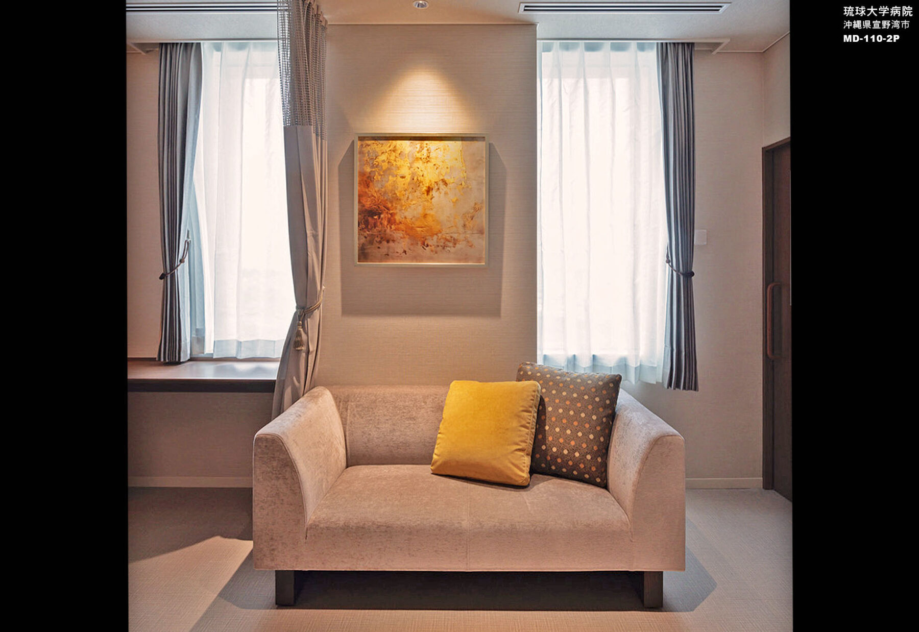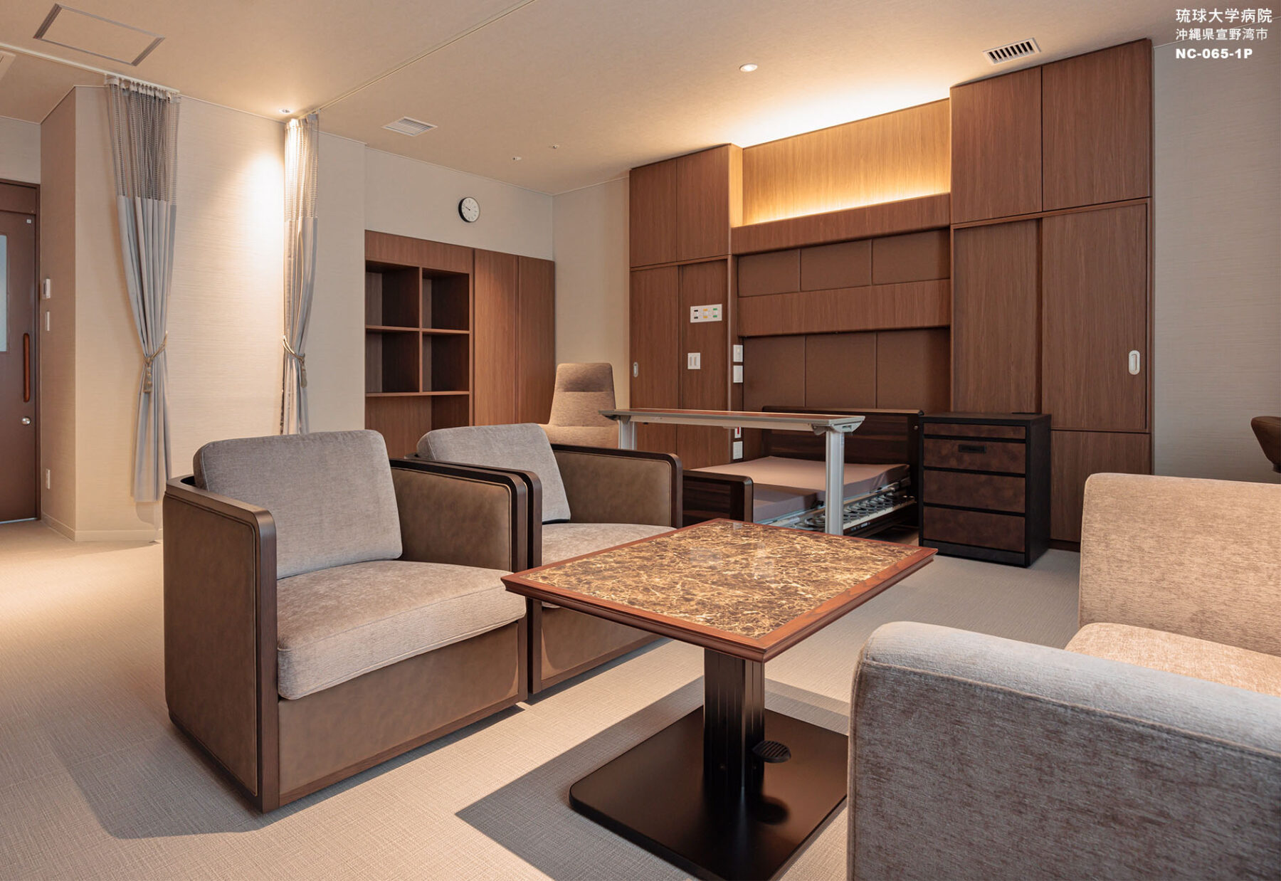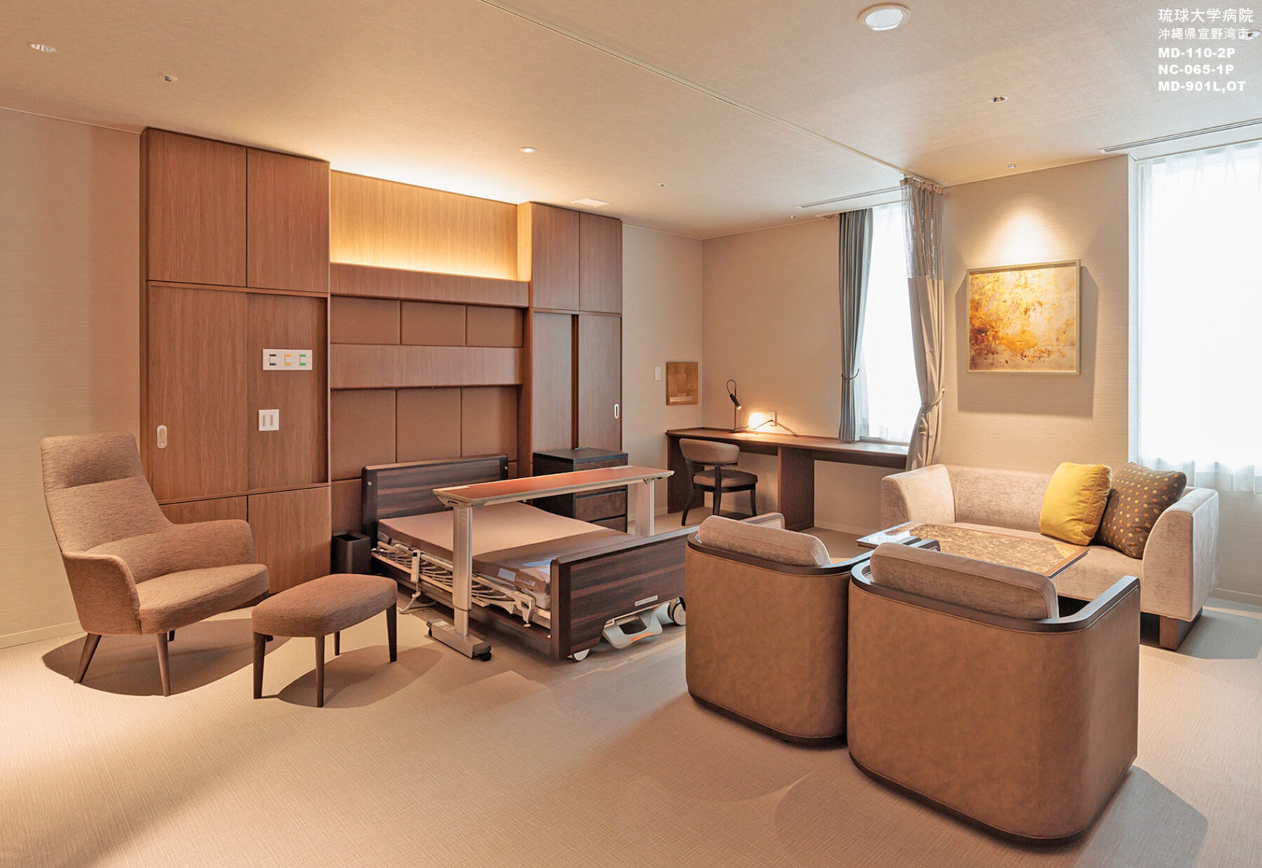 沖縄の中でもVIPな方を受け入れる琉球大学病院が新たな拠点へ場所を移すとのことで『質の高い医療に質の高い空間』をコンセプトに掲げました。国際豊かな土地に相応しい質の高い空間。尚且つ清拭性やメンテナンスを考慮した素材を選定し、患者様を想う快適で安全な空間づくりを目指しました。