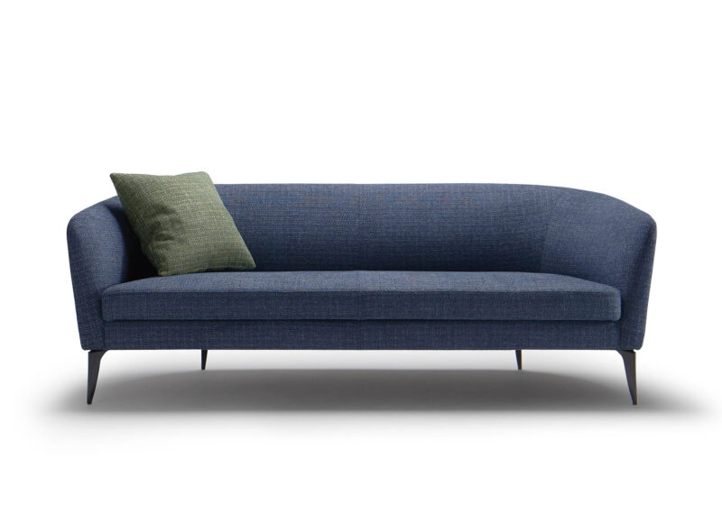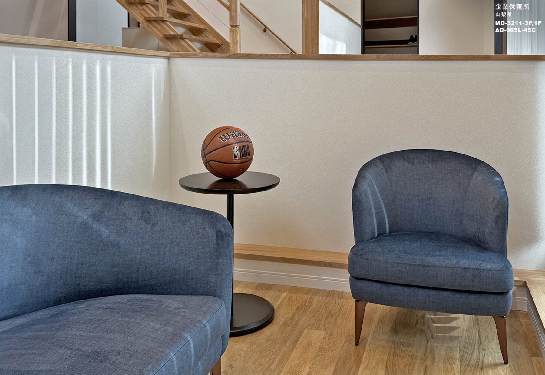 納入後の感想:生地の濃いめの色合いとデザインフォルムが広い吹き抜けの明るい内装の空間を引き締めてくれており、ゆったりとした使用感とまとまりのある空間を演出してくれました。
