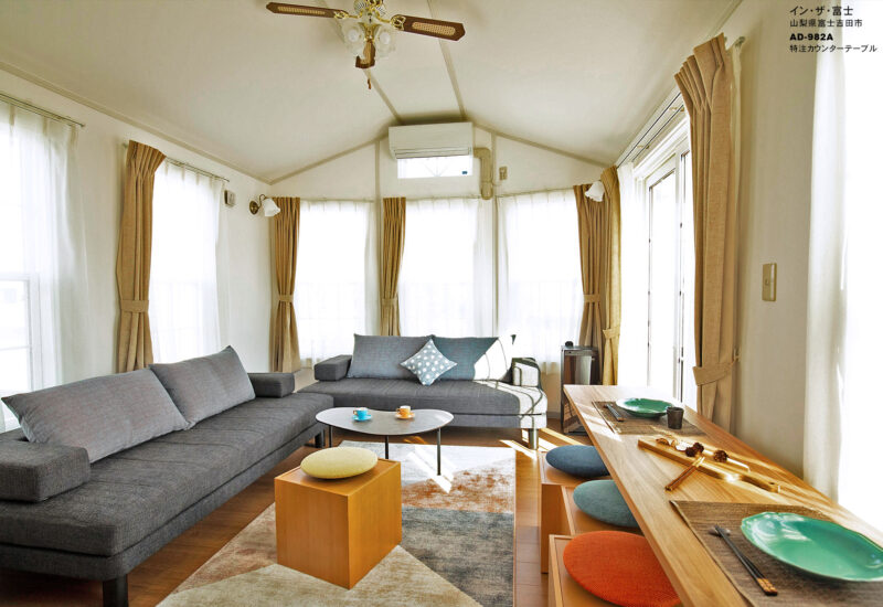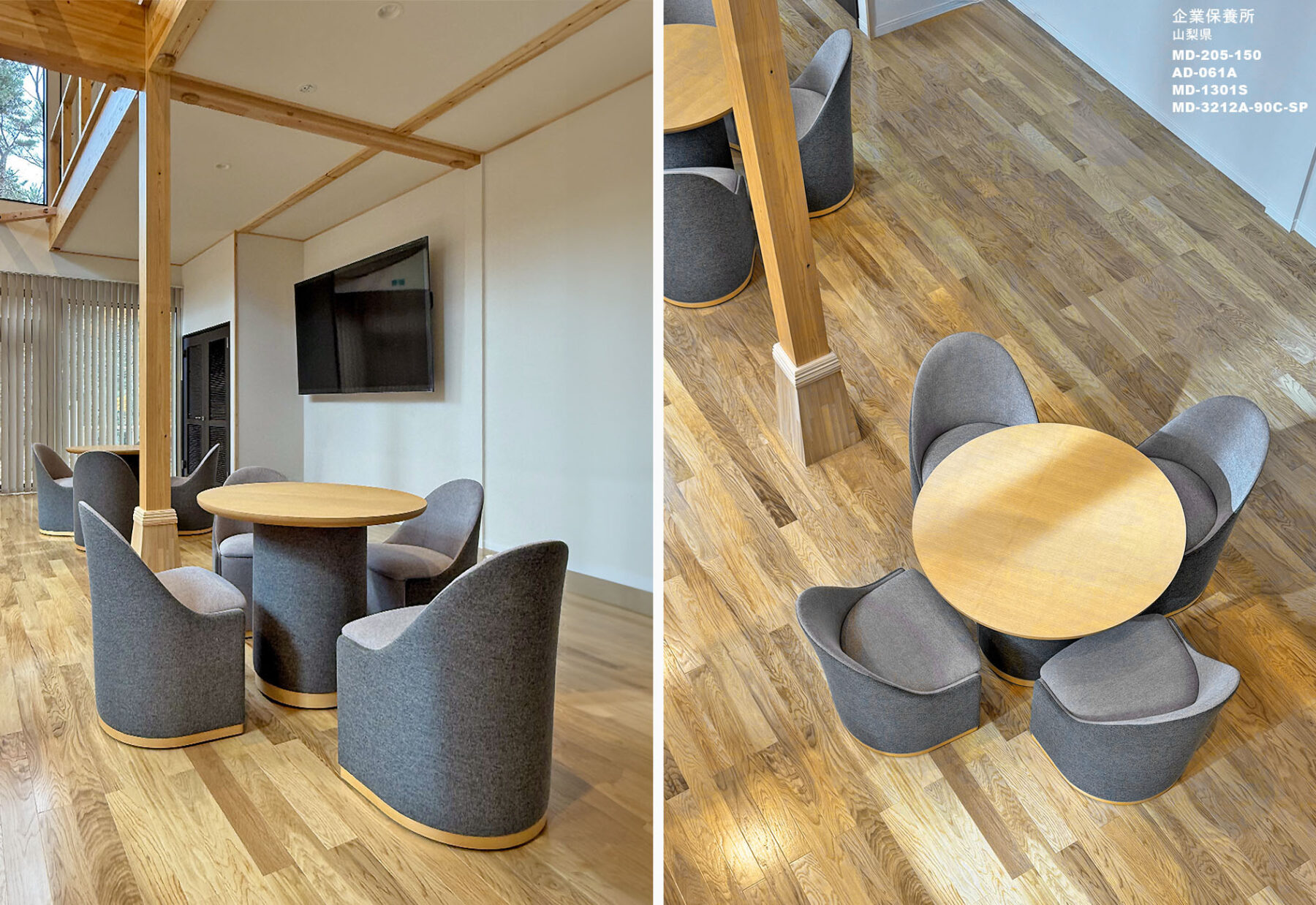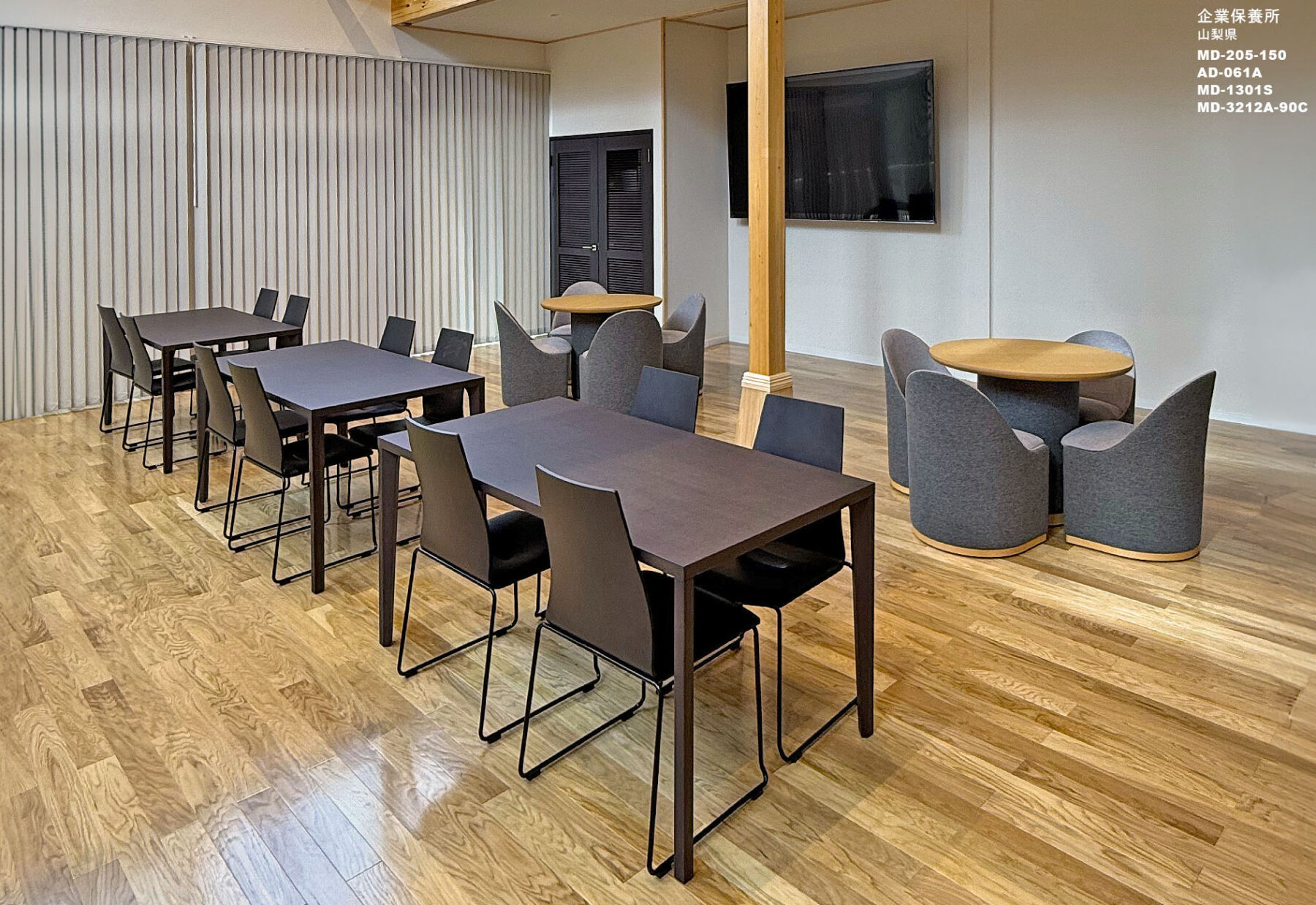 多くの社員やご家族が使用される企業の保養所ということで、まずは緑豊かな景色と澄み渡った空気の なかで、ゆっくりとくつろいでいただける空間を目指しました。大浴場やどこのお部屋からも富士山周辺の自然を楽しむことができるようになっています。それと同時にスポーツ施設の設備も整っているので、アクティブに活動された後にお食事を楽しんだり、大画面 TV でスポーツ観戦ができる大きな空間をフレキシブルに使える家具が大切でした。もちろん耐久性や清潔感も重要なポイントです。